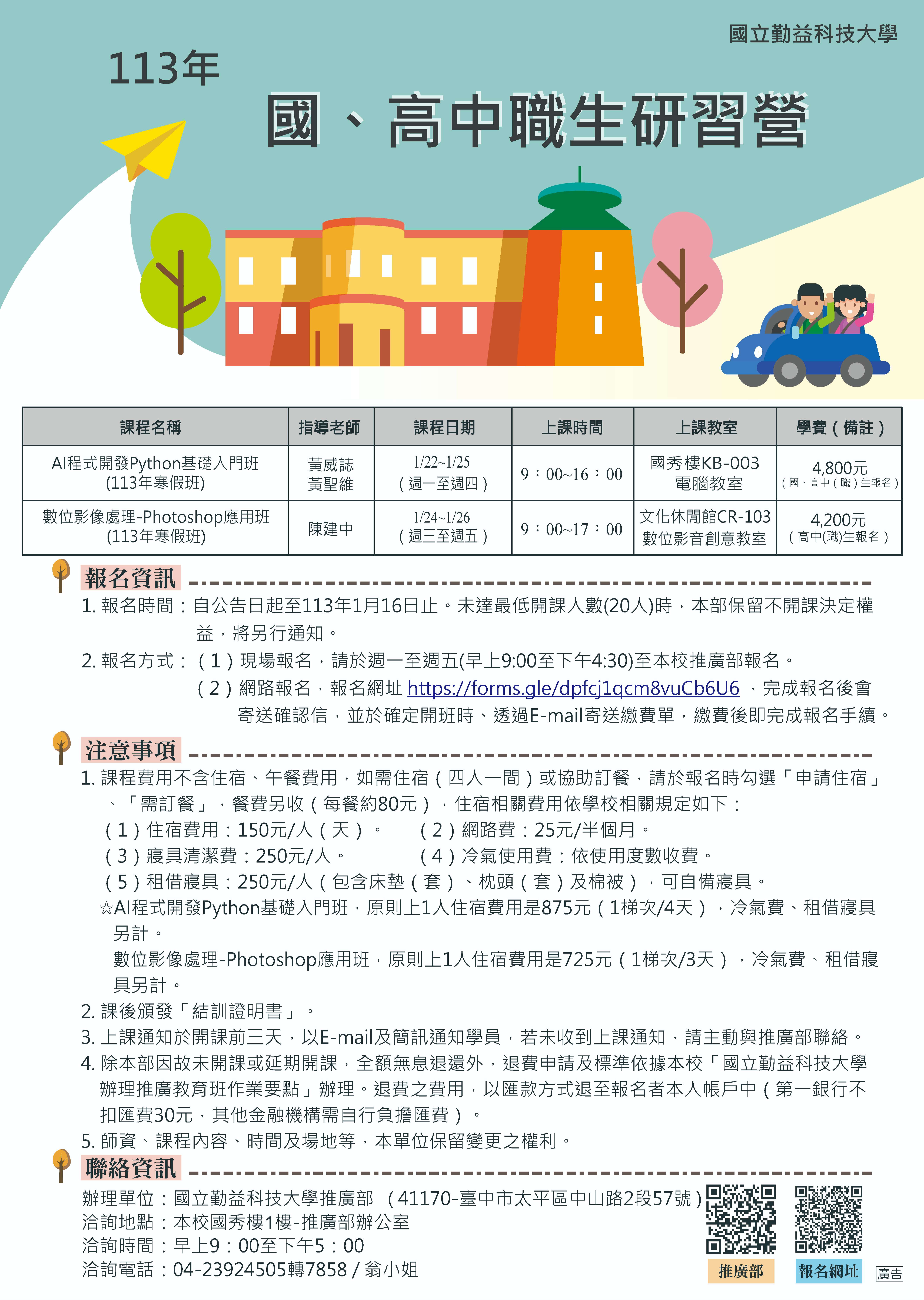 四、旨揭課程資訊可至本校推廣部網站(https://eeo.ncut.edu.tw/index.php)查詢,報名網址(https://forms.gle/dpfcj1qcm8vuCb6U6)。