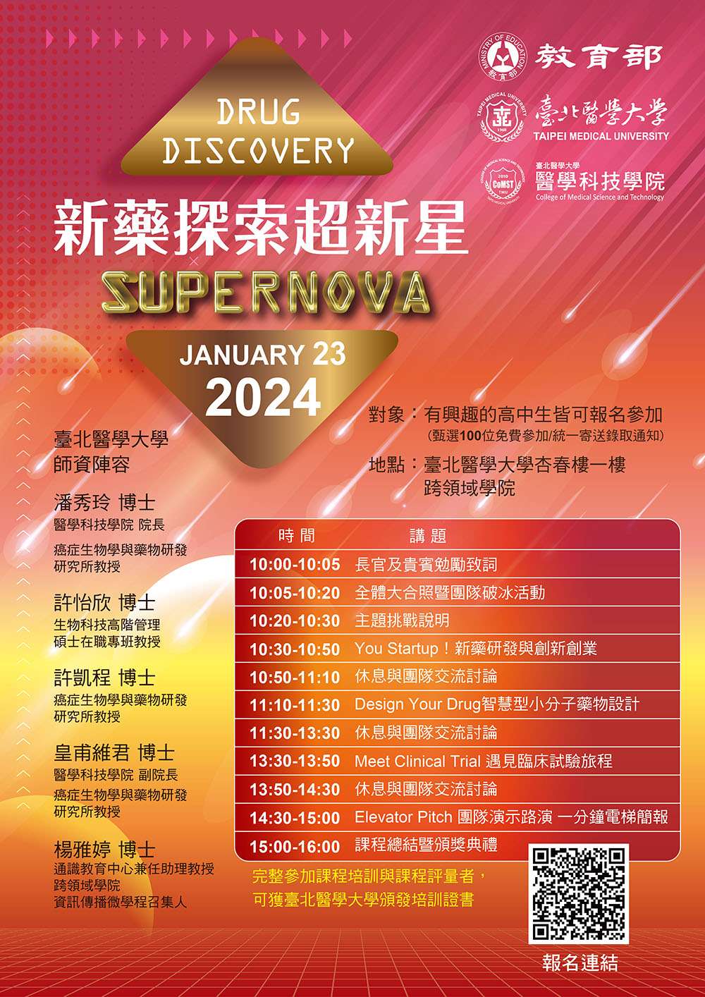 一、教育部補助大專校院STEM領域及女性研發人才培育計畫,適配高中生之「Drug Discovery Supernova新藥探索超新星科普培訓計畫」課程,訂於民國113年1月23日(二) 10:00- 16:00於臺北醫學大學跨領域學院辦理,報名方式為線上報 名,報名連結https://pse.is/5f8s32,請欲報名者參見報名表內詳細資訊並填寫相關內容,報名截止日期為112年12月31日。