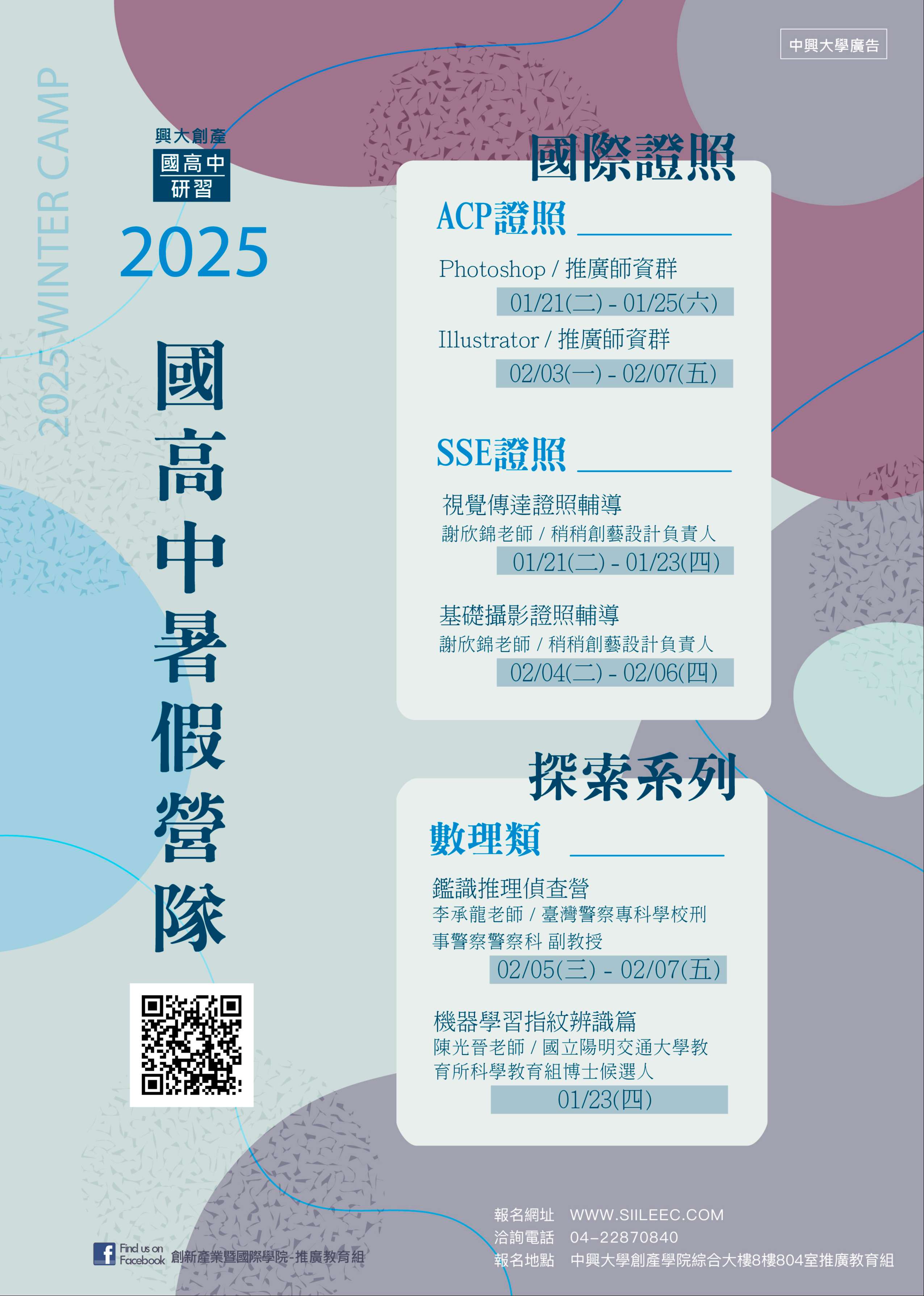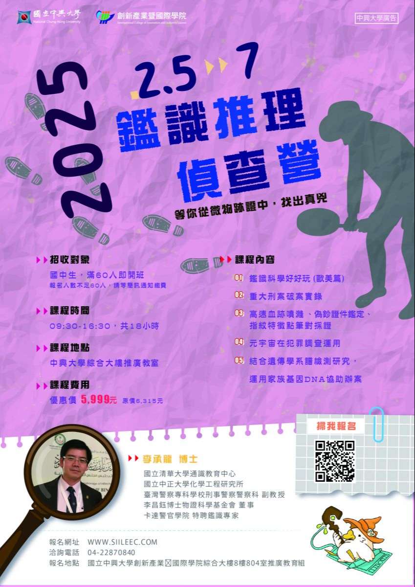 四、聯絡窗口:中興大學創新產業暨國際學院推廣教育組,電話 (04)22870840,詳情請參簡章與海報。
