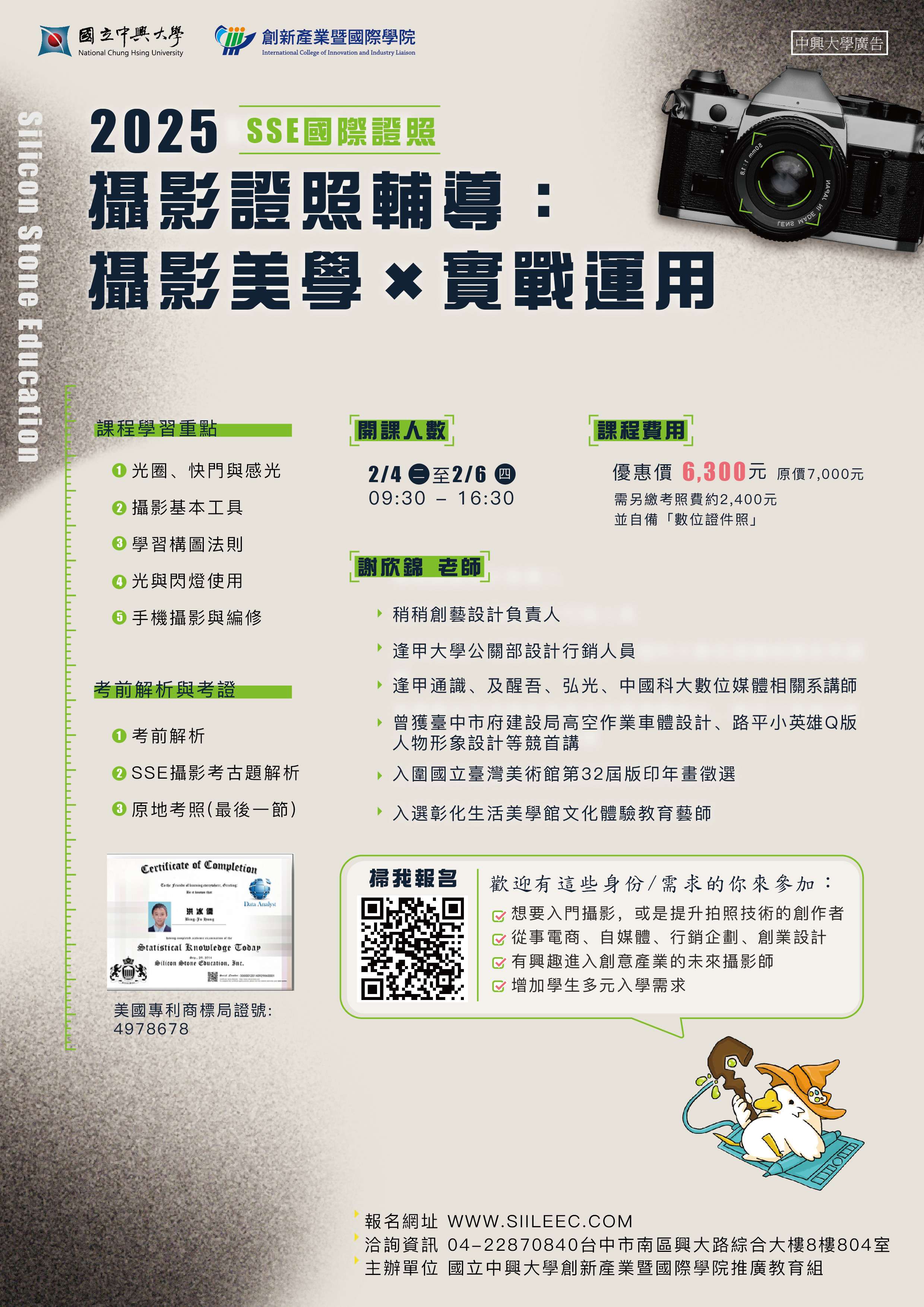 (二)針對想增進視覺傳達、攝影技能養成,提供《視覺傳達、基礎攝影國際SSE證照輔導》,為您未來想從事電商、自媒體創作之路,或申請國內外單位備審加分。