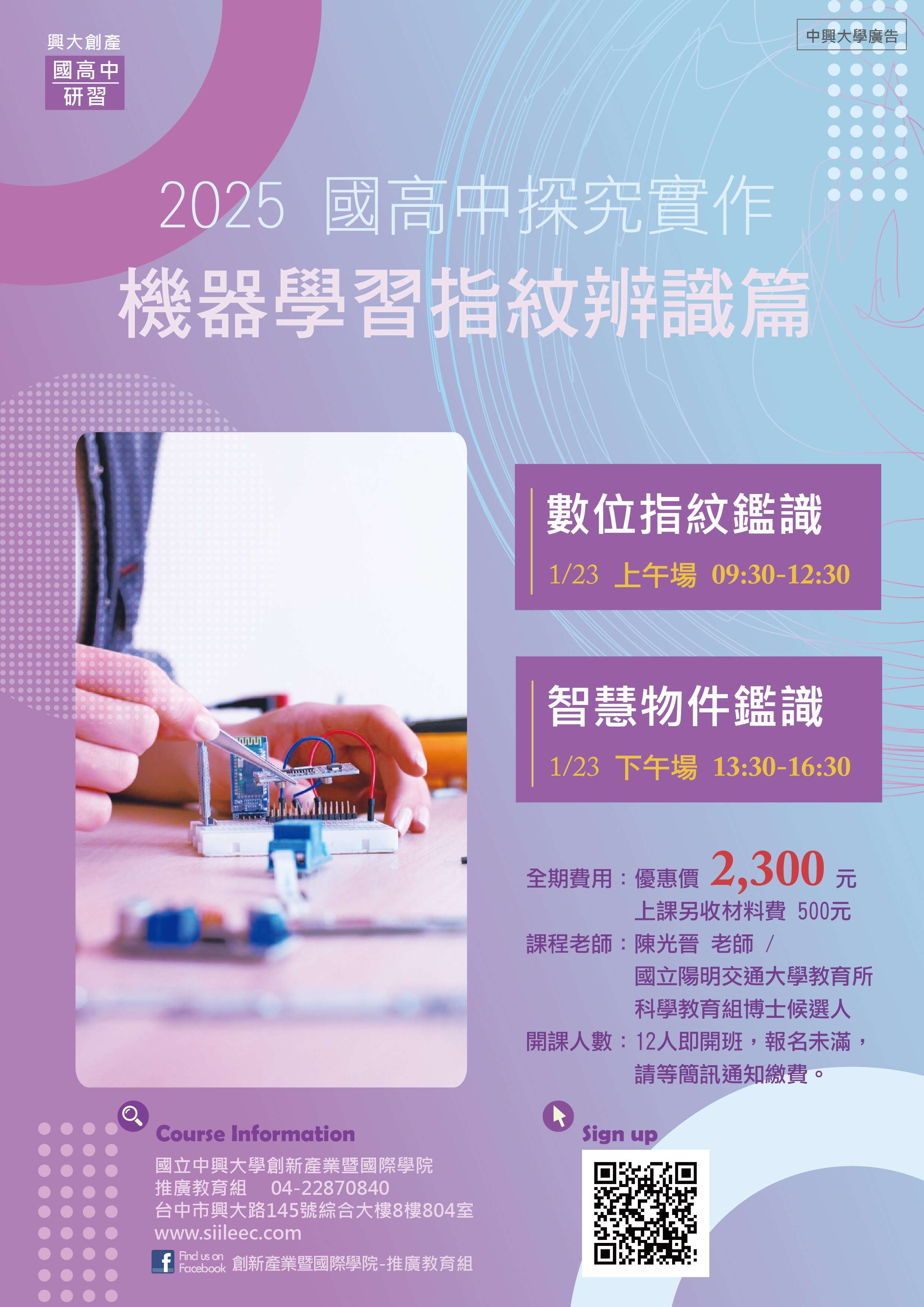(八)報名方式:請至創產學院線上報名系統報名 (http://www.siileec.com/index.php?subject_type=38)。至「國立中興大學創新產業暨國際學院線上報名繳費系統」,點選「國高中生研習」加入會員即可報名。
