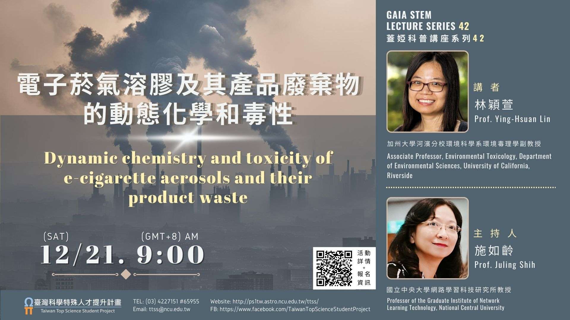 一、本次講座將由林穎萱教授帶領我們深入探討電子菸氣溶膠的化學特性與毒性。隨著電子菸的使用,其相關健康風險與環境問題已引起廣泛關注。林教授將解析電子菸氣溶膠的動態化學過程,並探討其中的有害物質的潛在危害,讓我們更深入了解電子菸對健康與環境的影響。