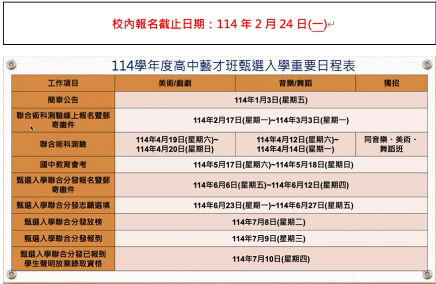 臺灣北區 114 學年度高級中等學校藝術才能班招生