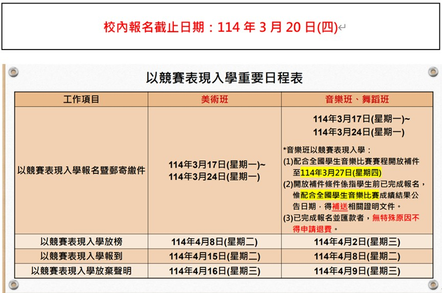 (2)競賽表現入學:114年3月17日~3月20日(一)