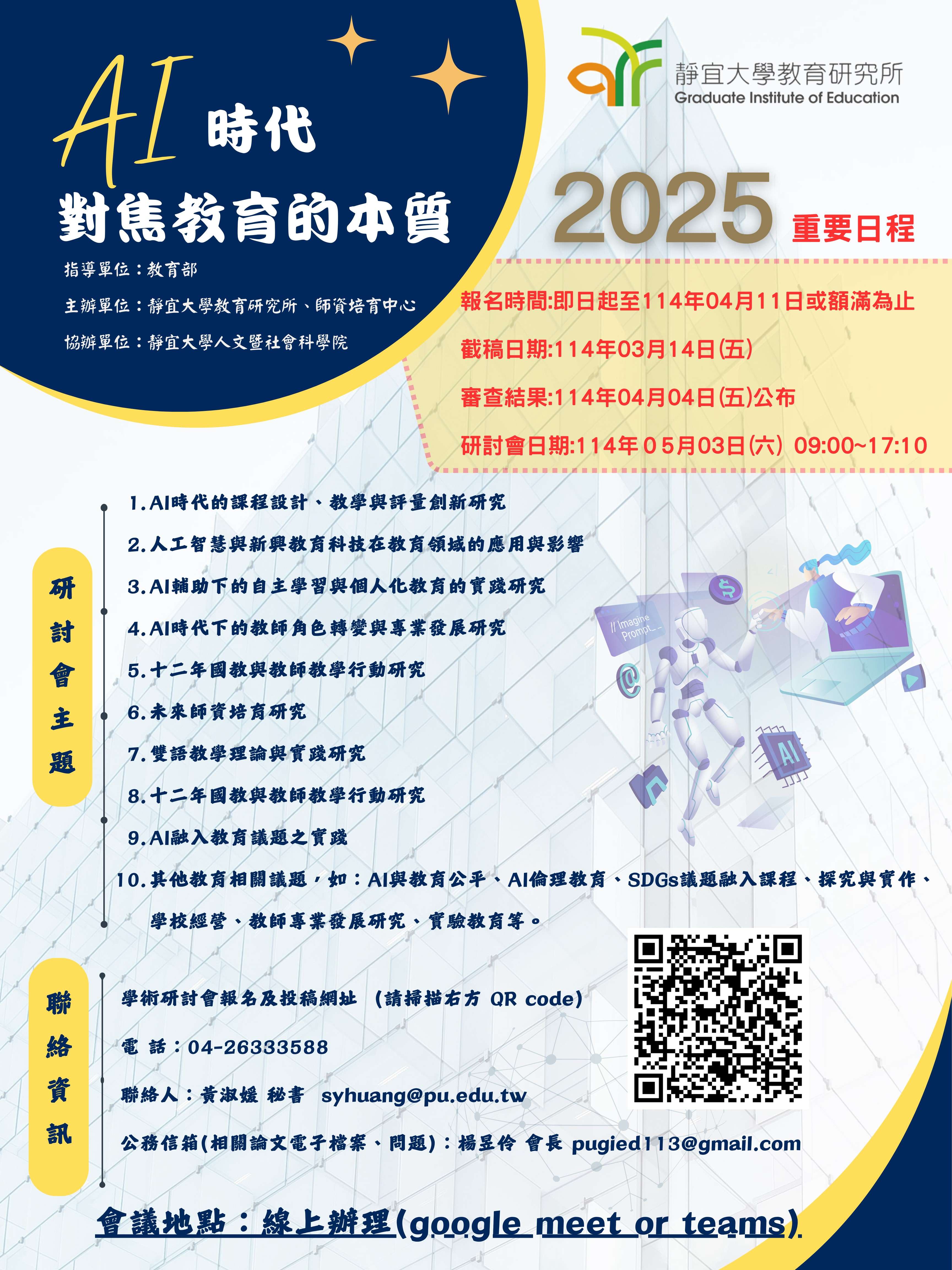 四、研討會計畫書及海報詳如附件,研討會主題、投稿須知、 報名等相關訊息,本研討會網址:https://activity. pu.edu.tw/actnews/gallery.php?Sn=37查詢。