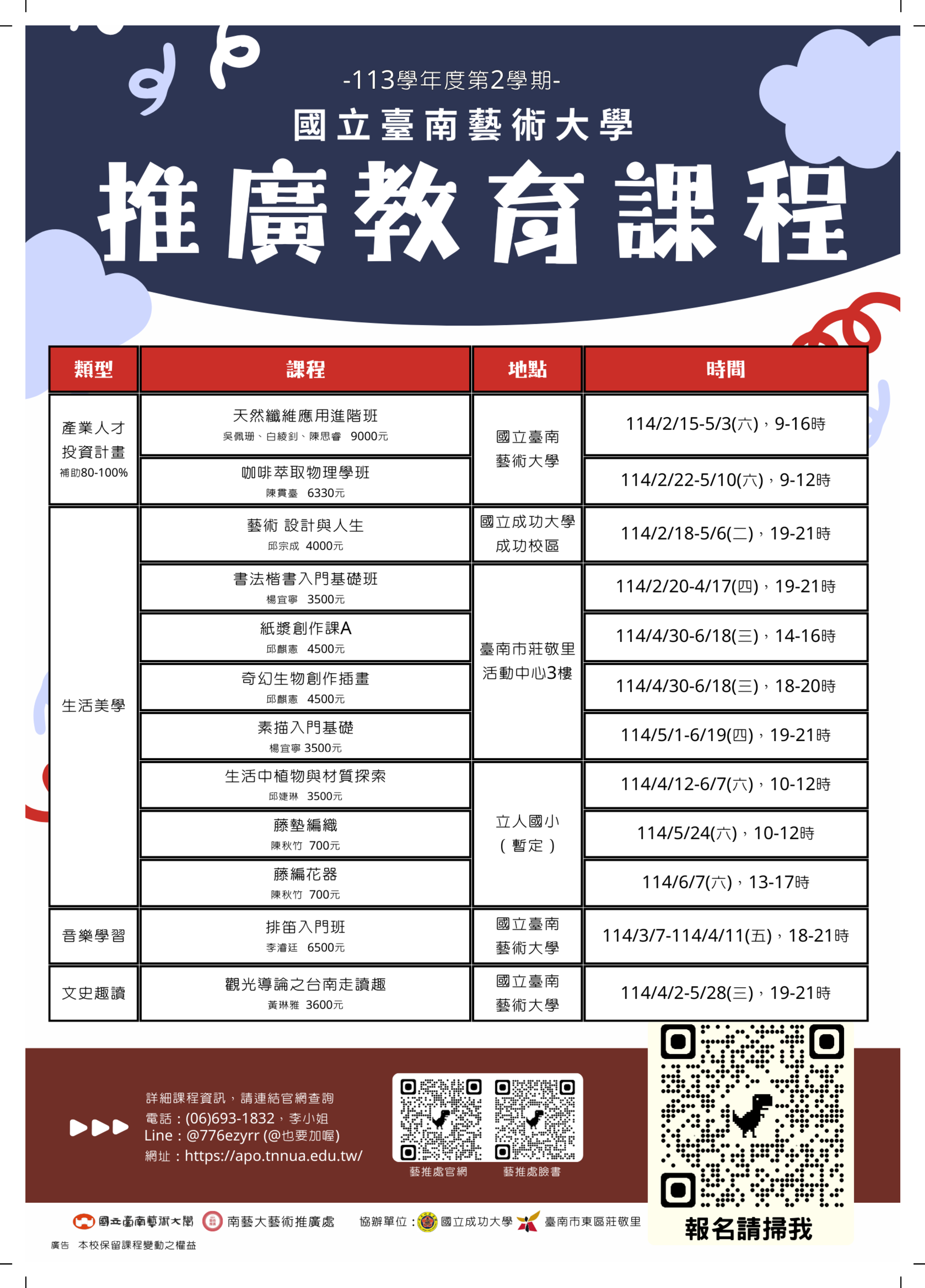 一、旨揭課程即日起開始受理報名,各班將自114年2月起陸續 開課。 二、更多課程資訊請至本校藝術推廣處官網查詢,網址: https://apo.tnnua.edu.tw/p/406-1060-42882,r1164. php?Lang=zh-tw。三、課程聯絡人及電話: