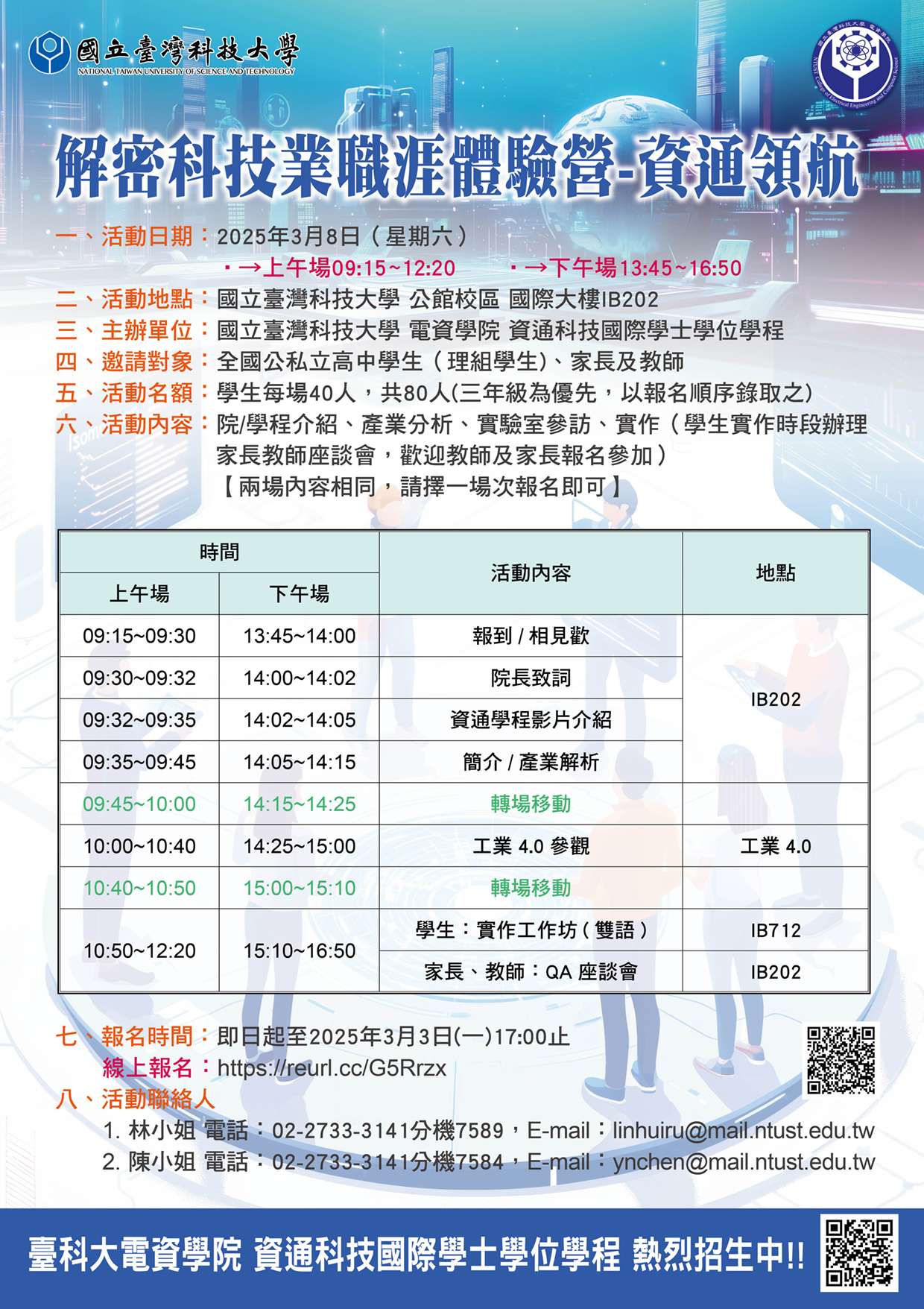 二、為協助學、家長、教師了解本學程之特色與規劃,於114年 3月8日舉辦「解密科技業職涯體驗營_資通領航」。【兩場 內容相同,請擇一場次報名參加即可】