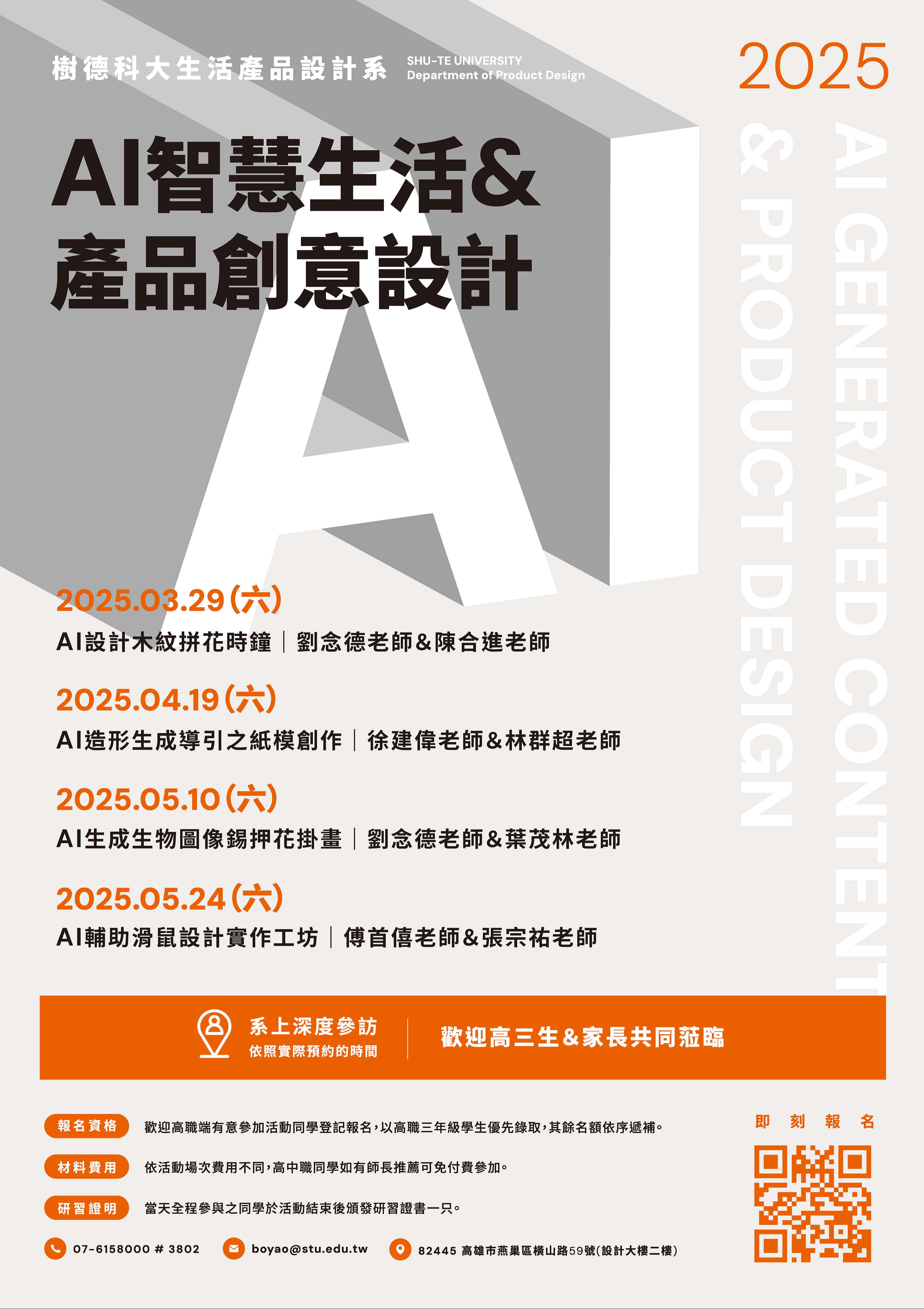一、活動主旨:樹德科技大學生活產品設計系舉辦【2025 AI智慧生活×產品創意設計研習營】活動,邀請高中職學生前來參加體驗並進行師生交流活動,提早探索體驗AI智慧生活×產品創意設計等相關活動內容。