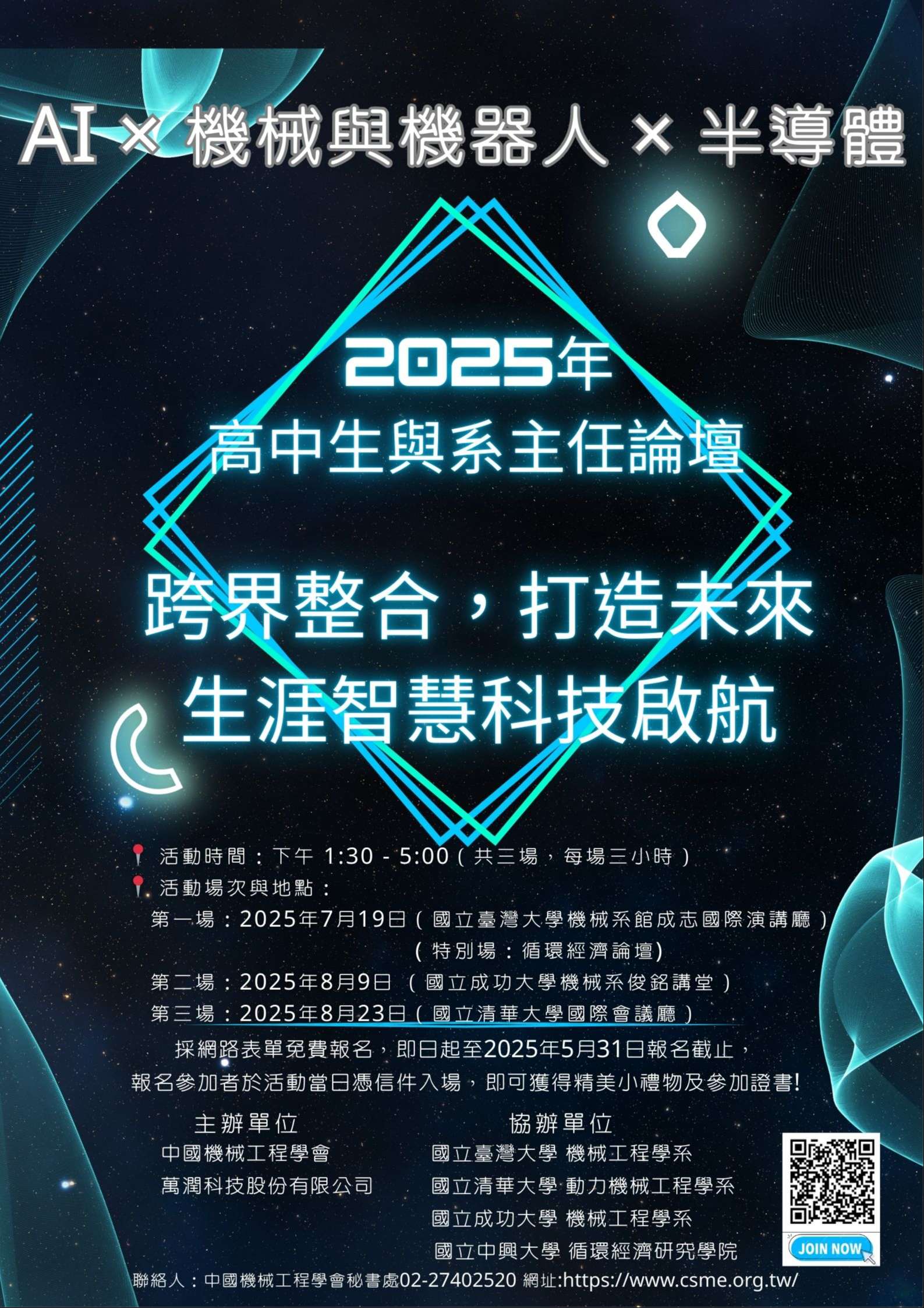 一、活動主旨:因應人工智慧、智慧機械與機器人及半導體技術快速融合,未來科技人才須具備跨域整合能力。為協助高中學生提前掌握科技發展脈動與生涯方向,中國機械工程學會特舉辦「2025年高中生與系主任論壇」,邀請國內頂尖大學機械系主任進行專題分享,啟發學生對未來科技領域之興趣與理解。