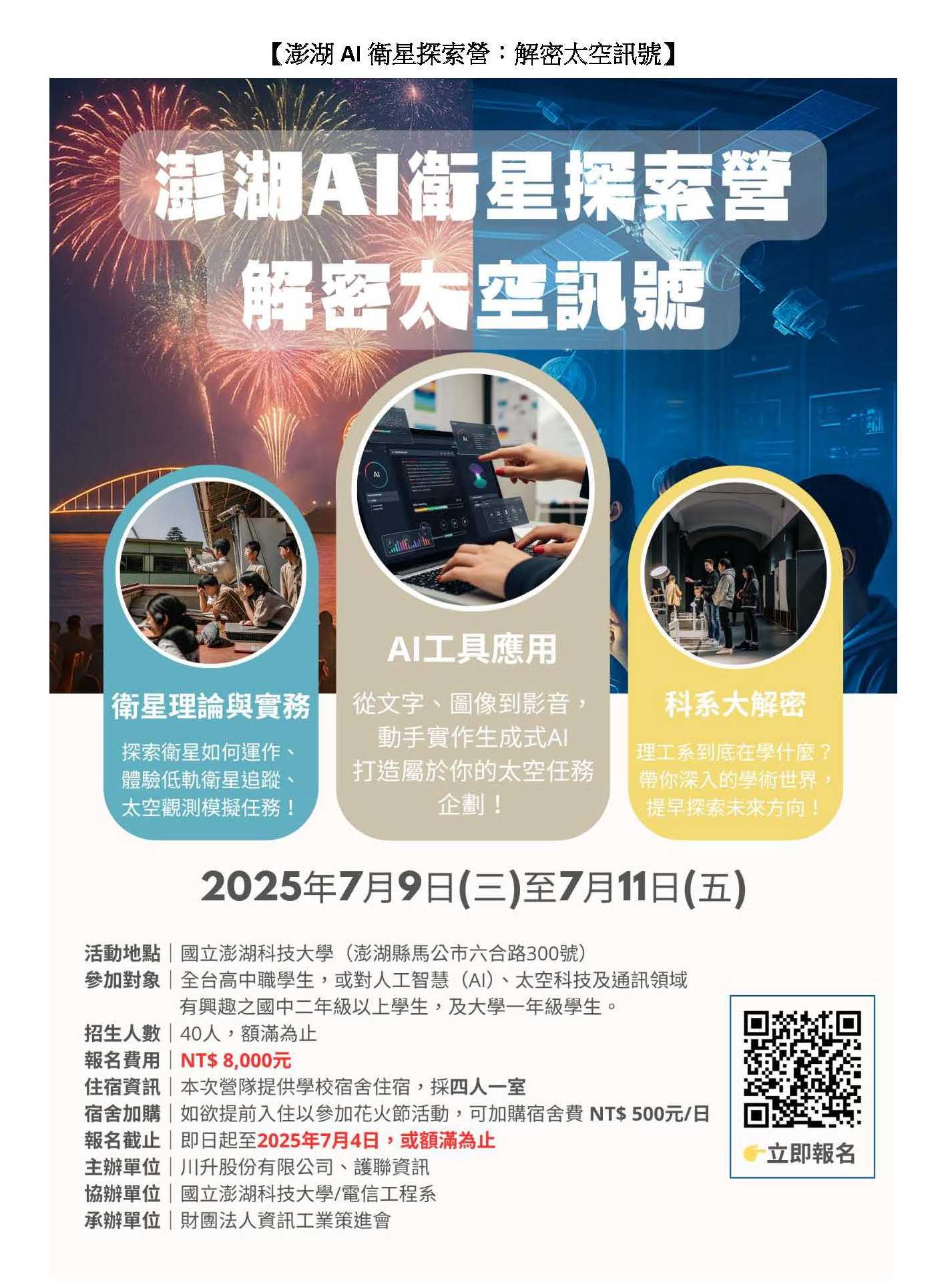 一、結合AI與衛星通訊應用的沉浸式實境挑戰營。透過遊戲化任務、小隊合作與澎湖在地走讀,讓同學從零開始,一探AI與低軌衛星奧秘。