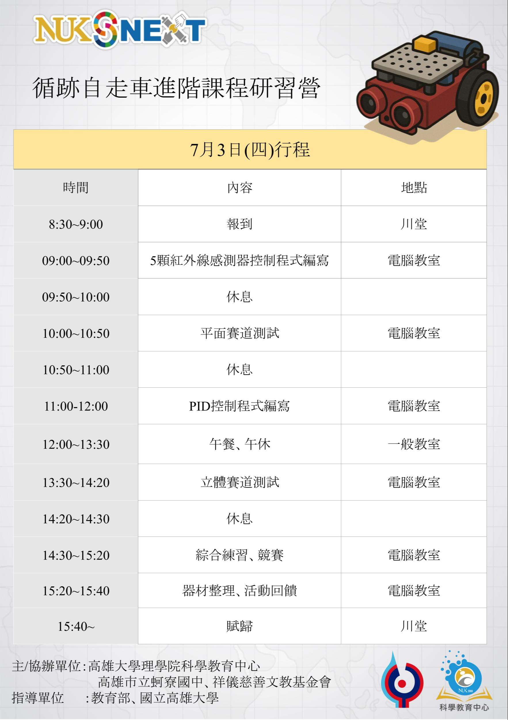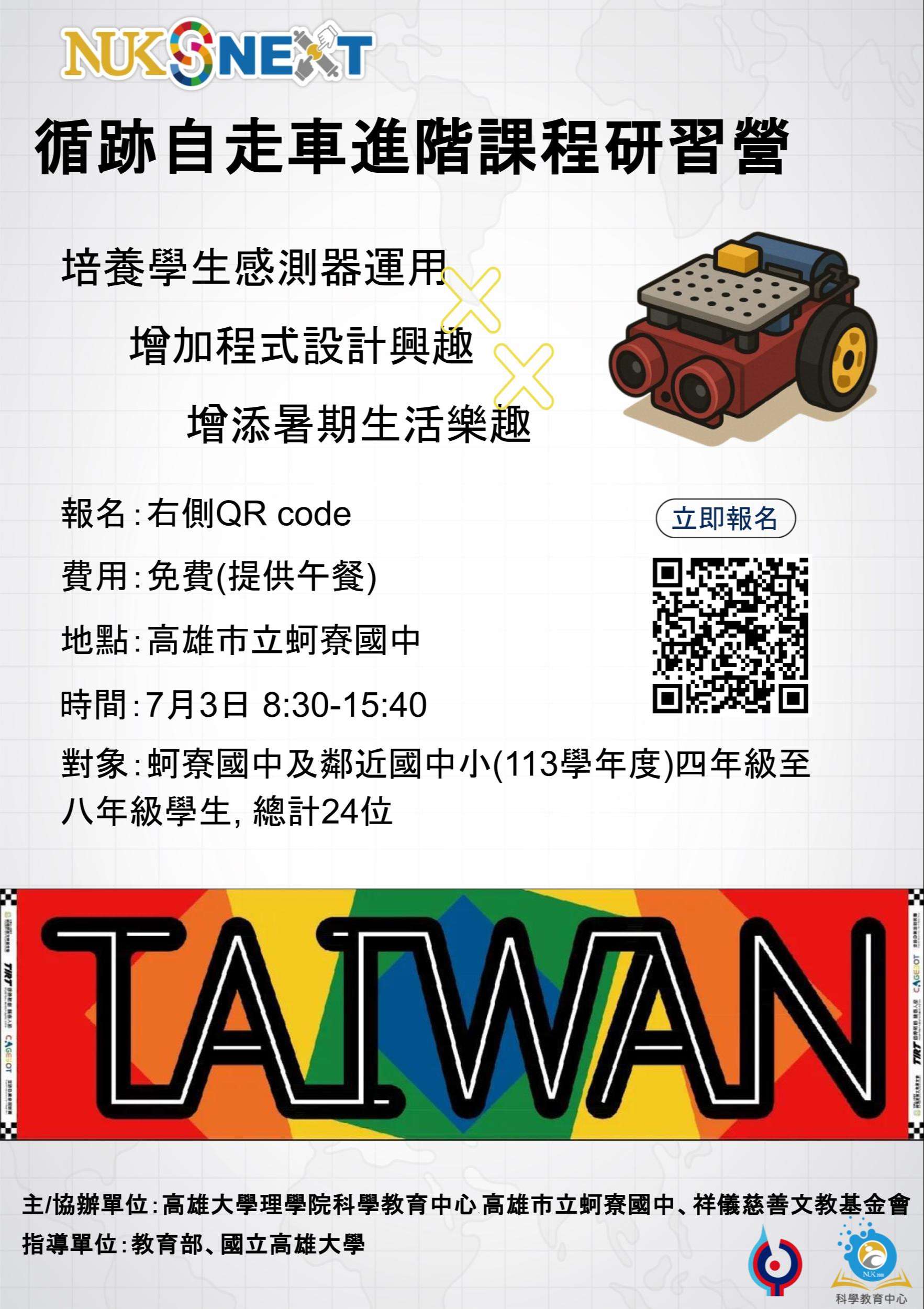 一、主辦單位:國立高雄大學科學教育中心二、活動主旨:培養學生感測器應用能力、提升程式設計興趣。三、活動日期:114年7月3日(星期四),上午8時30分至下午3時40 分四、活動地點:高雄市立蚵寮國民中學。