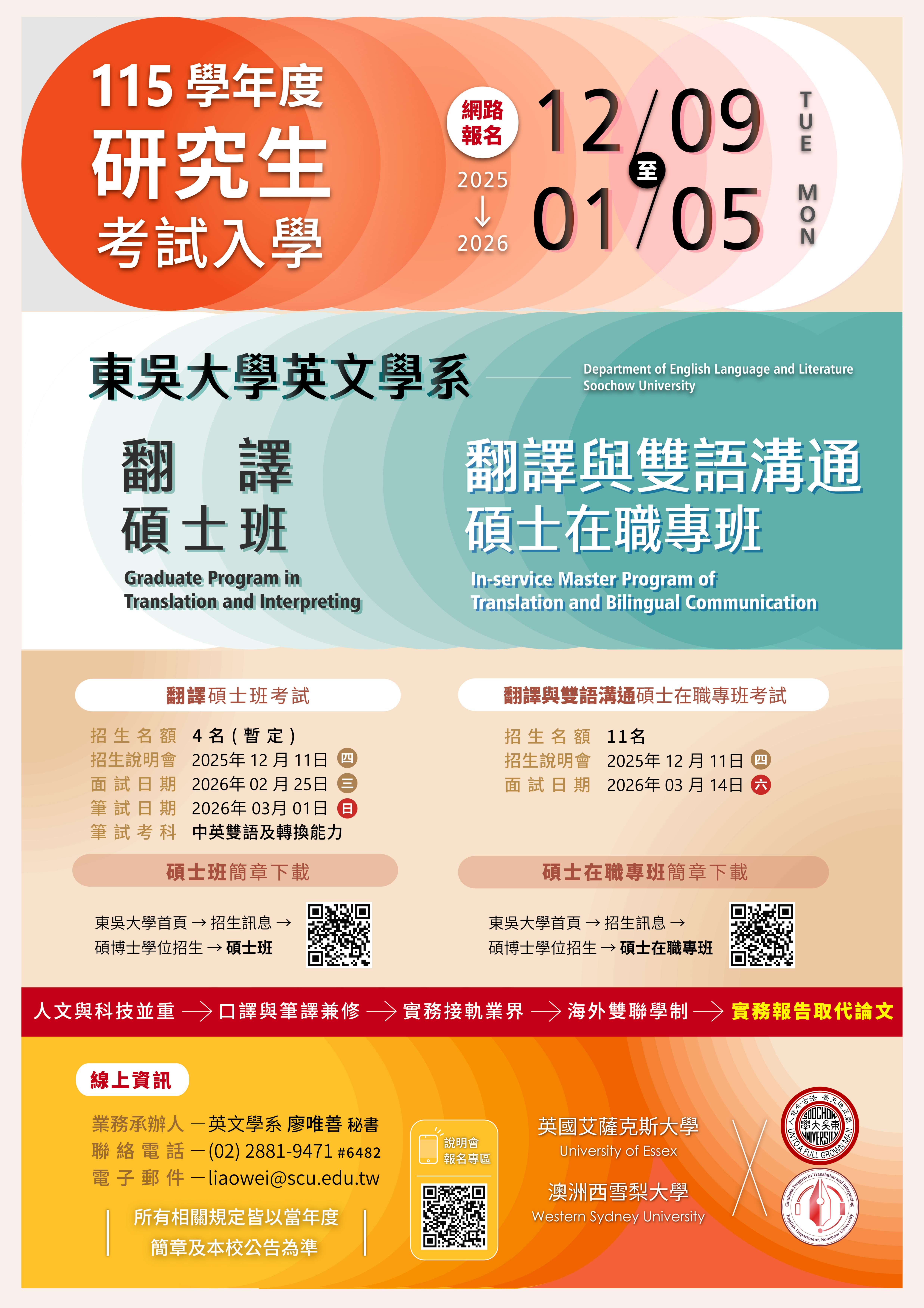一、本校英文學系翻譯與雙語溝通碩士在職專班之課程含括口 譯、筆譯、翻譯科技與應用、高階外語溝通,共四個面向 之實務訓練,協助貴屬教師在語言課程中強化教學深度。 且所有課程安排於本校城中校區(臺北市中正區,近西門 及小南門捷運站)授課,交通方便。