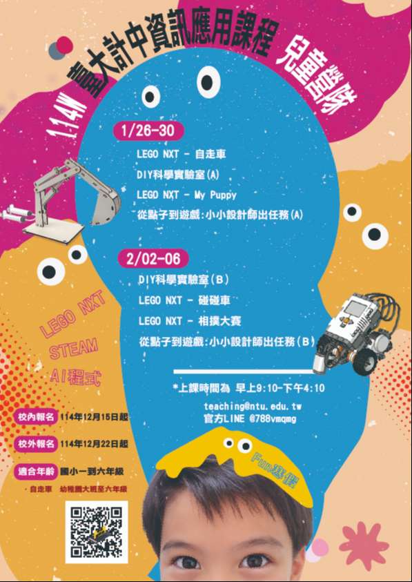 1.本校計算機及資訊網路中心於115年1月2日起辦理寒假資訊應用課程,課程詳細資訊與報名網址請至該中心網站查詢https://teach.cc.ntu.edu.tw/course。