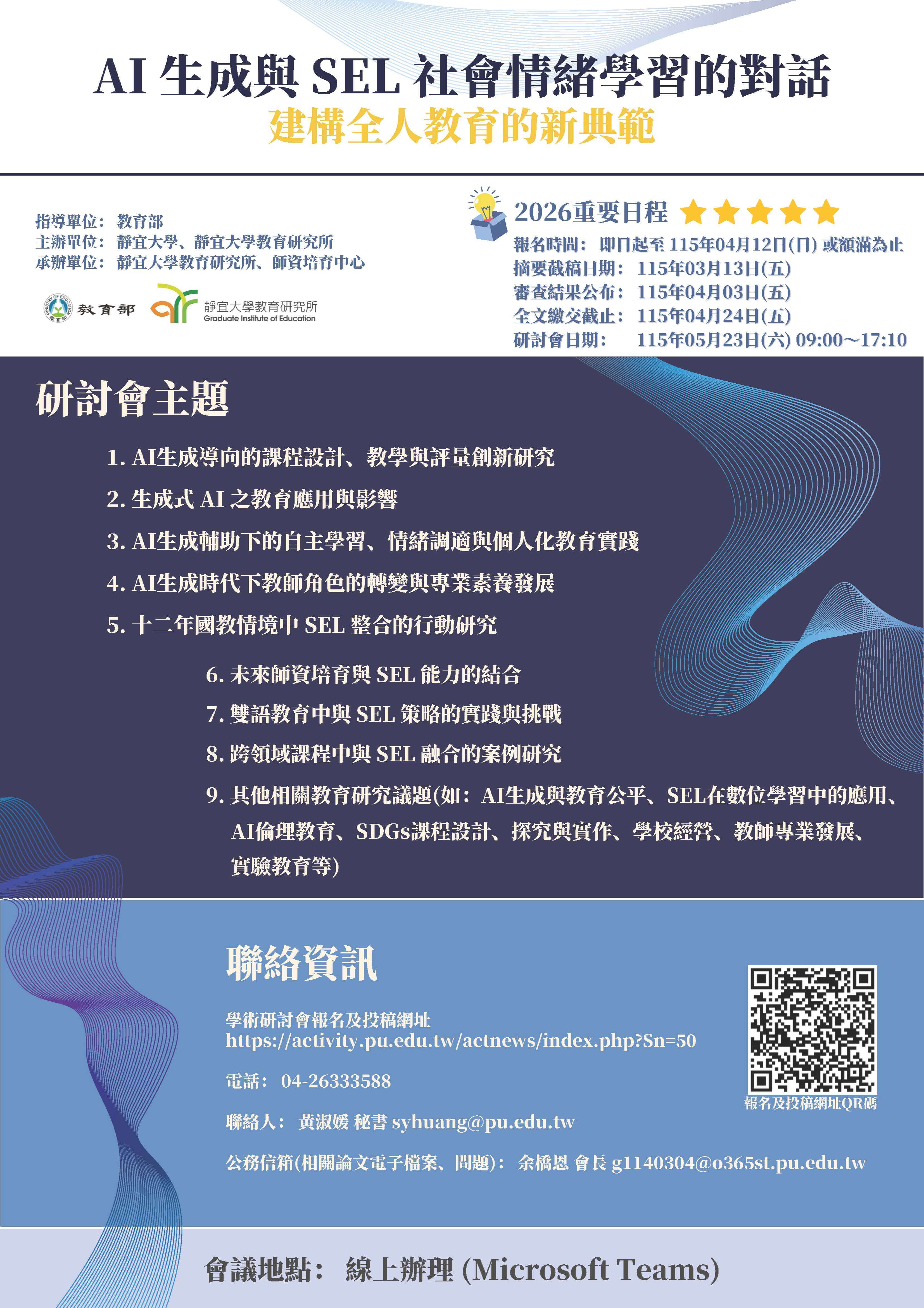 二、徵稿主題如下:(一)AI生成導向的課程設計、教學與評量 創新研究。(二)生成式AI之教育應用與影響。(三)AI生成 輔助下的自主學習、情緒調適與個人化教育實踐。(四)AI 生成時代下教師角色的轉變與專業素養發展。(五)十二年 國教情境中SEL整合的行動研究。(六)未來師資培育與SEL 能力的結合。(七)雙語教育中與SEL策略的實踐與挑戰。 (八)跨領域課程中與SEL融合的案例研究。(九)其他相關教 育研究議題(如:AI生成與教育公平、SEL在數位學習中的 應用、AI倫理教育、SDGs課程設計、探究與實作、學校經 營、教師專業發展、實驗教育等)。