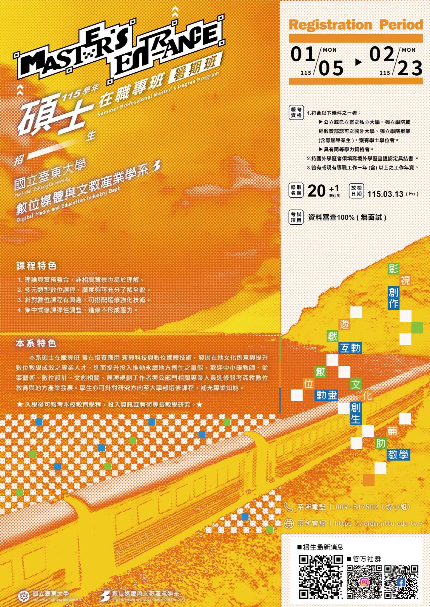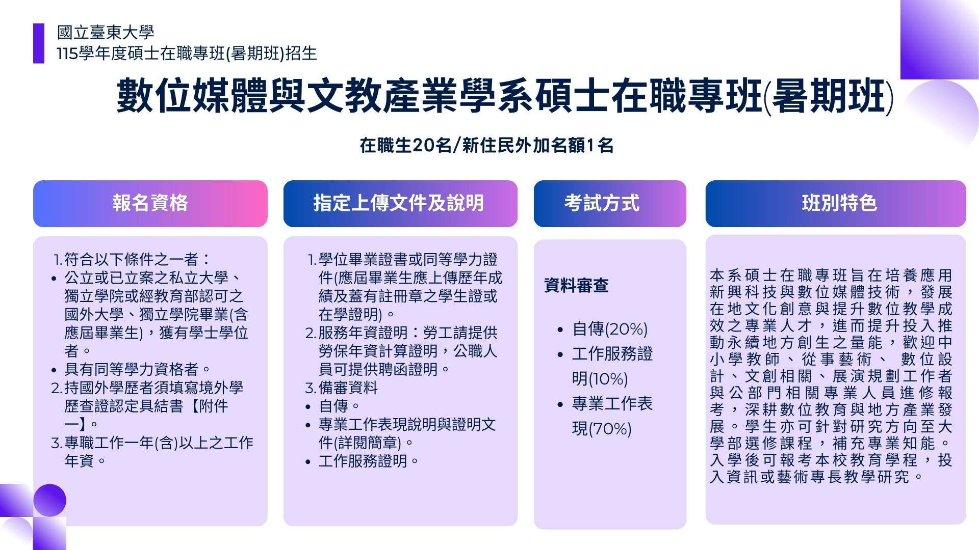 一、本校數位媒體與文教產業學系以數位設計與文教應用為核 心,為全臺少數結合數位思維、數位教學輔助與地方人文 特色之暑期碩士在職專班,採暑期集中六週修課;課程設 計兼顧理論與實務,即使非相關科系背景亦能順利銜接, 並可依研究、創作或技術報告等多元途徑完成學位。