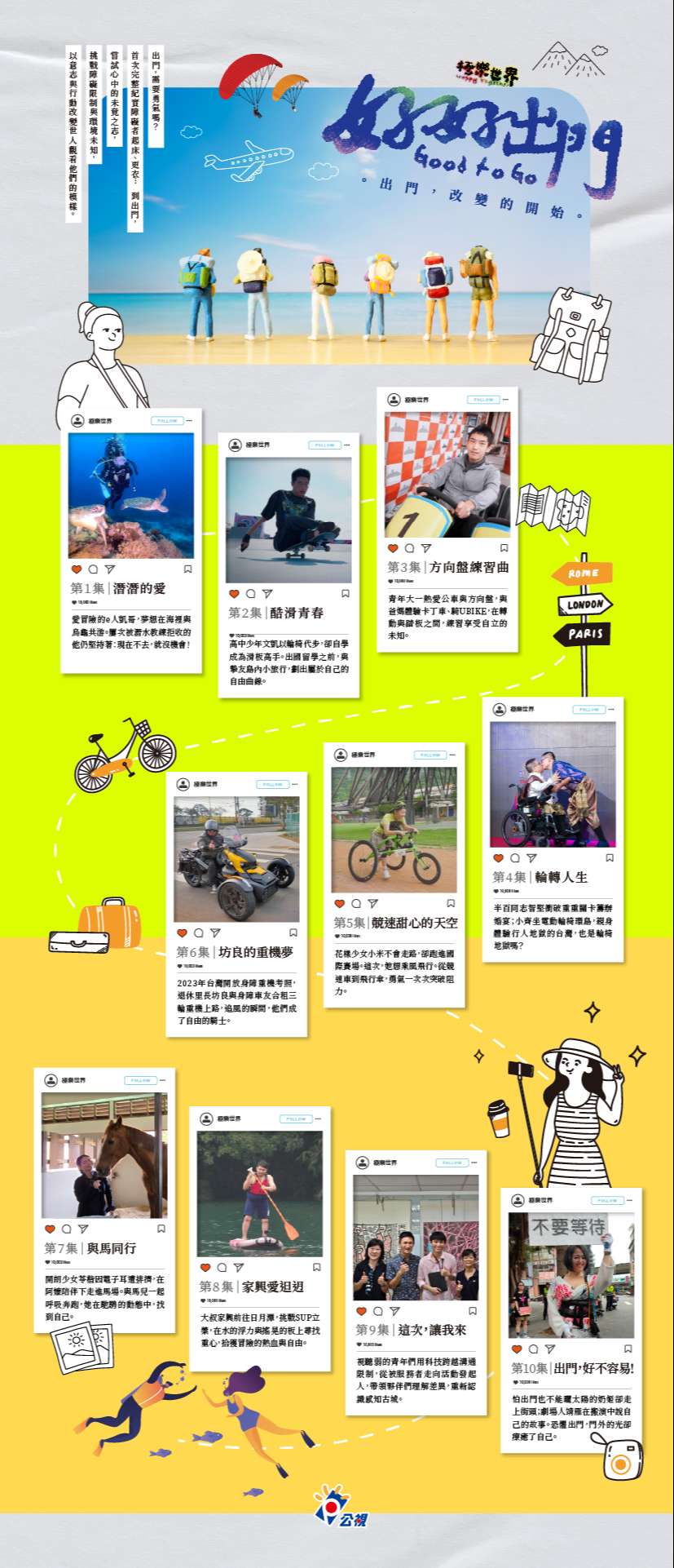 一、《極樂世界之好好出門》是一個身心障者的節目,出門, 對你來說是日常,對有些人卻是一場挑戰。《極樂世界之 好好出門》以紀實視角,貼近輪椅族、視障、聽障、自閉 症與精神障礙者的生活現場,從起床、更衣到踏出家門, 記錄他們如何在身體限制與環境阻礙中,找回行動的可能。這不只是關於障礙,而是每個人都可能遇見的生活勇 氣。另本季同時播出「情境字幕版」,盼聽障朋友能夠同 步觀賞。