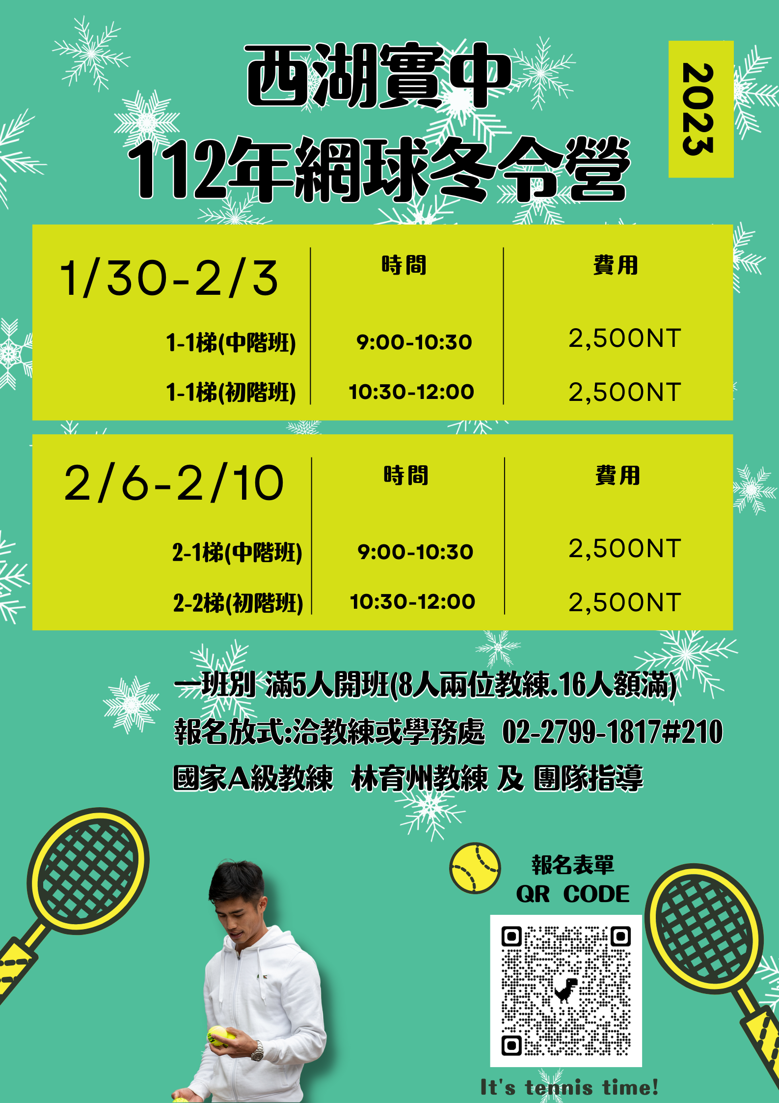 1、第1-1梯次(中階班,有網球經驗): 112年1月30日至2 月3日,上午9:00-10:30