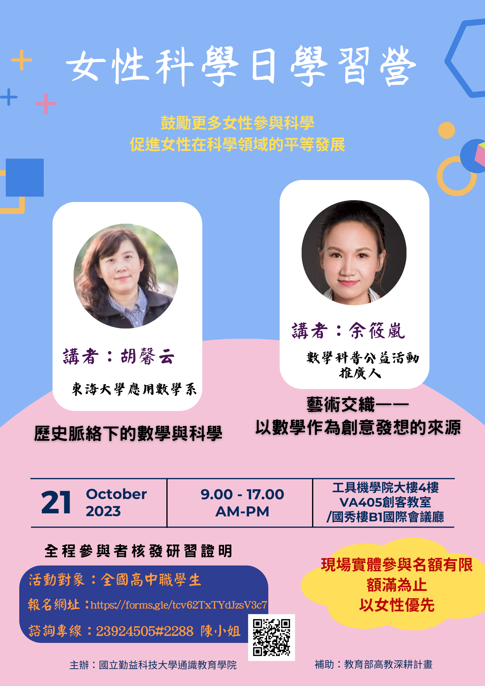 (一)目的:為鼓勵更多女性參與科學,促進女性在科學領域的平等發展,特舉辦女性科學日學習營。