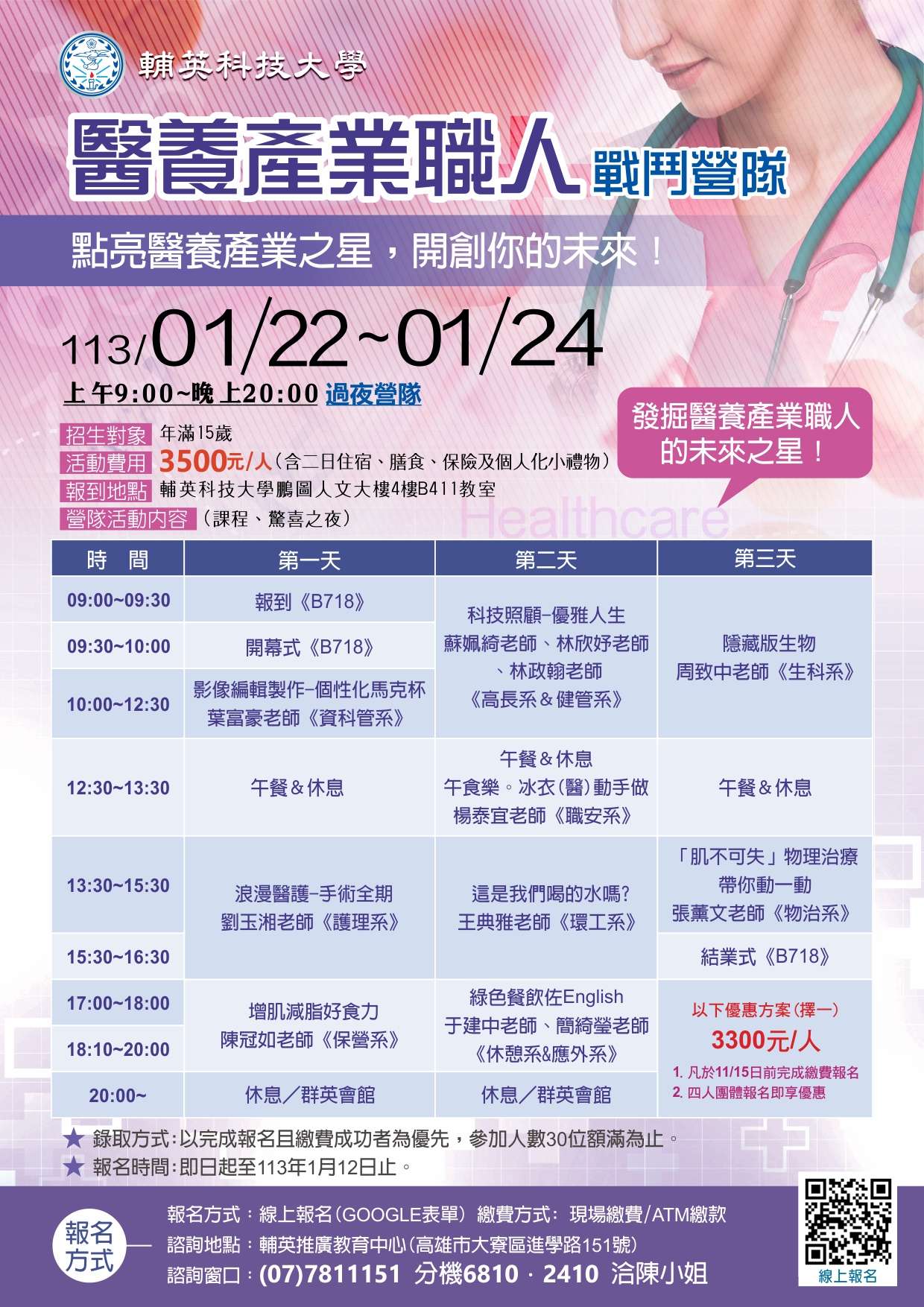 (一)課程時間:113年01月22日至113年01月24日 09:00~20: 00(過夜營隊)。