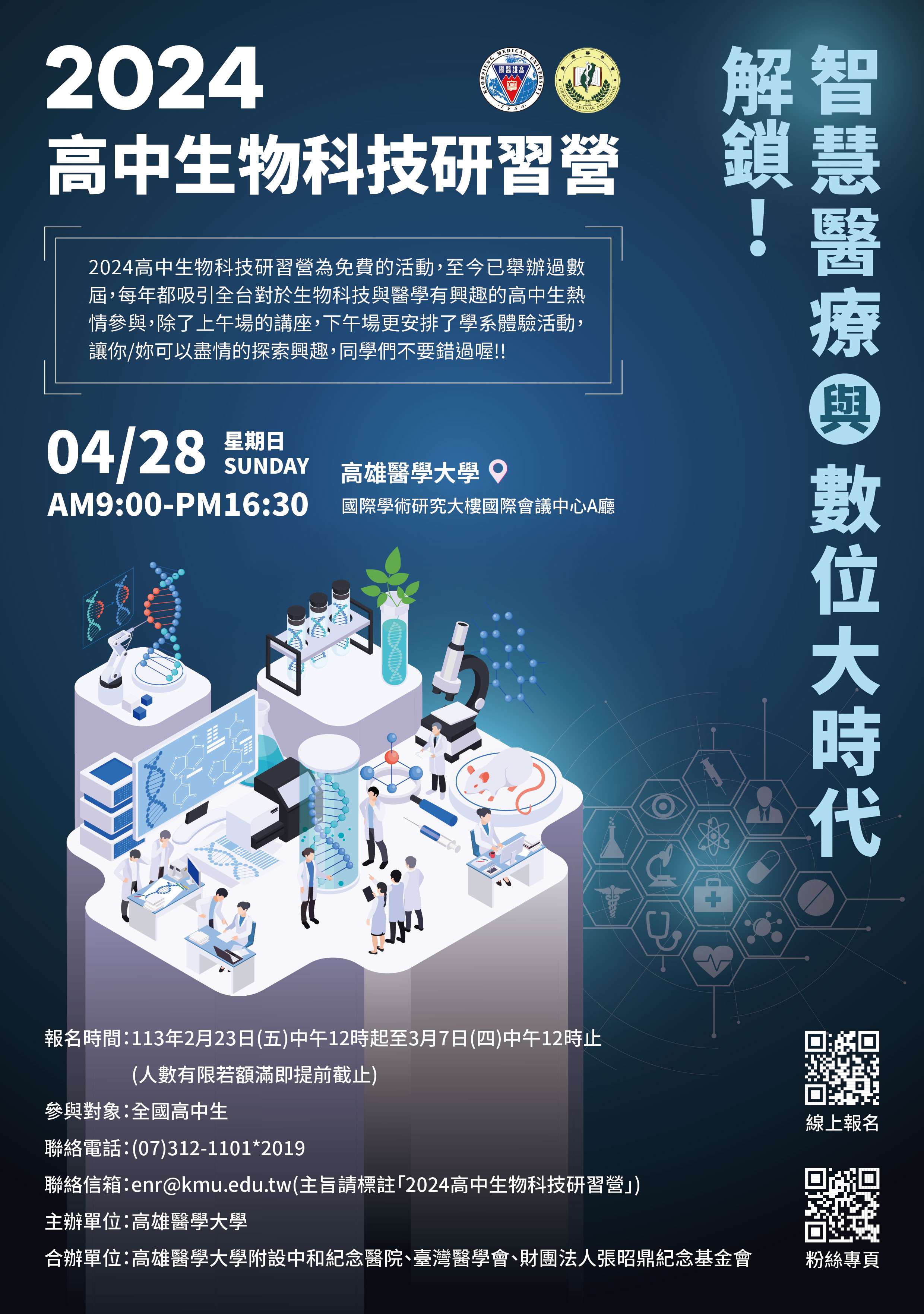六、活動詳細資訊請詳參附件海報,歡迎撥打07-312-1101分機2109洽詢,或是寄送電子郵件至enr@kmu.edu.tw (主旨請標註「2024高中生物科技研習營」)。