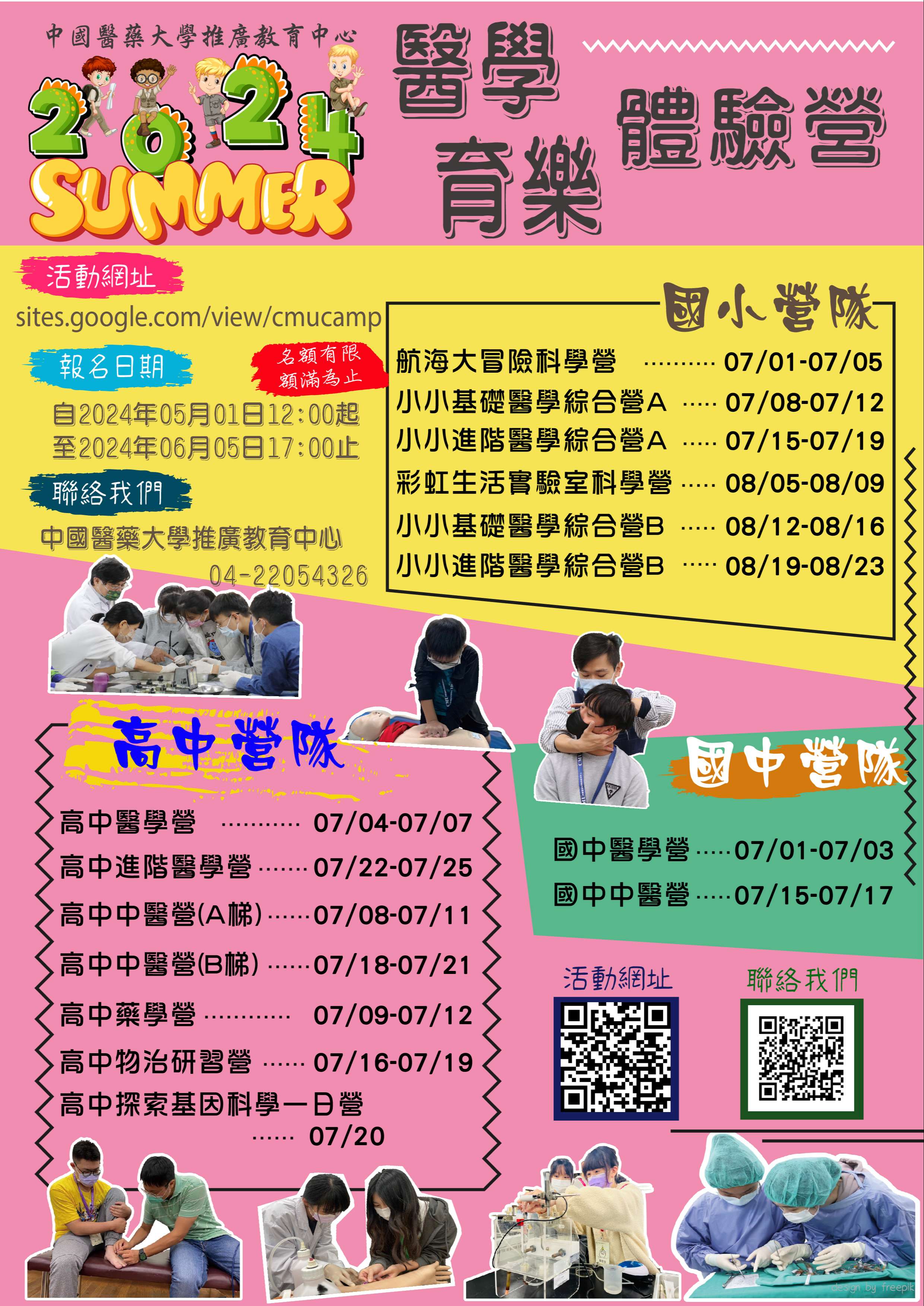 一、中國醫藥大學推廣教育中心辦理「2024暑假國、高中醫學營隊」, 讓學生更能了解中西醫學的奧秘,奠定日後選系志向。