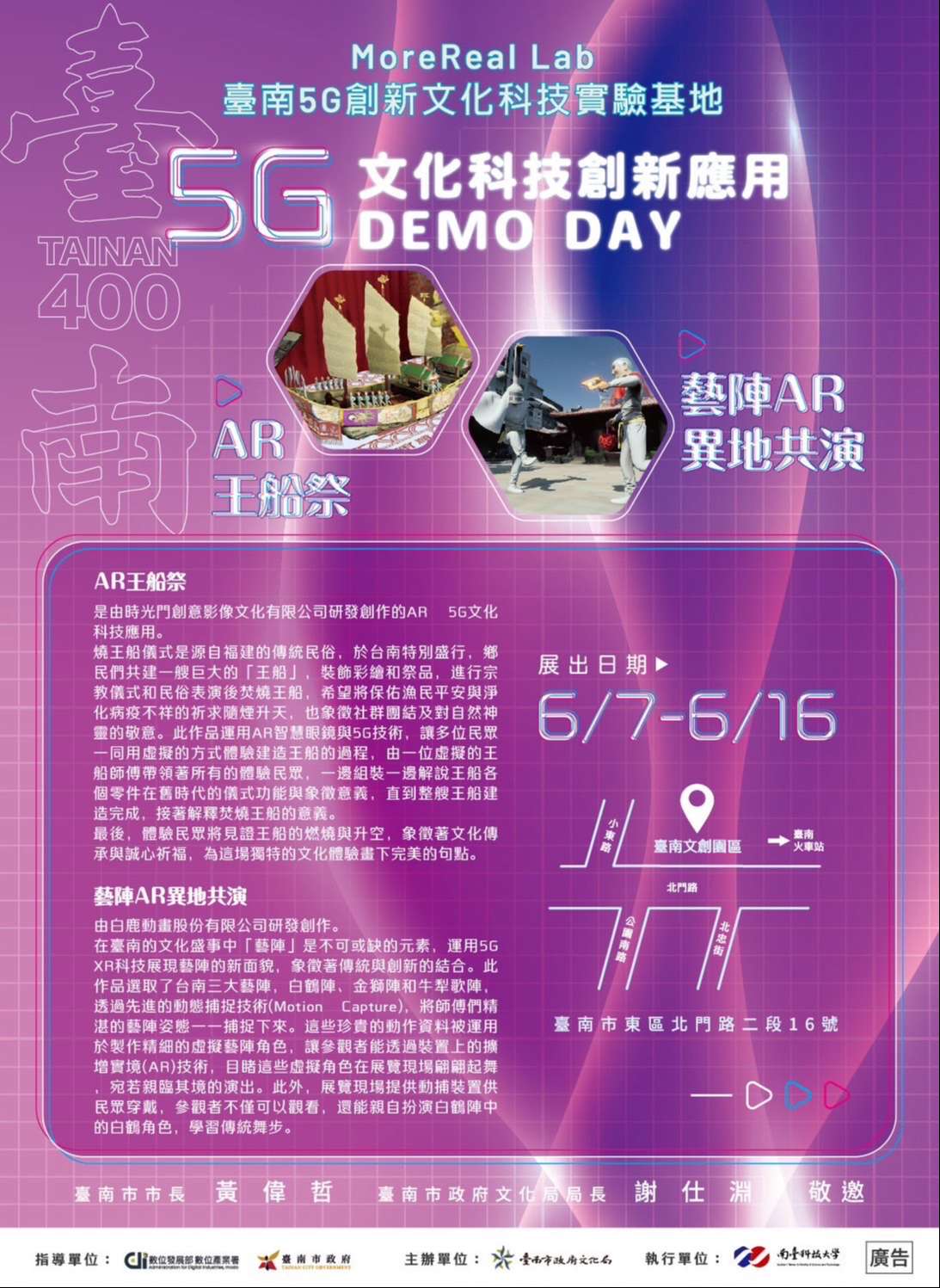一、體驗活動:Demo展主題聚焦傳統文化與5G科技的結合,展示「藝陣AR異地共演」及「AR王船祭」等創新作品。
