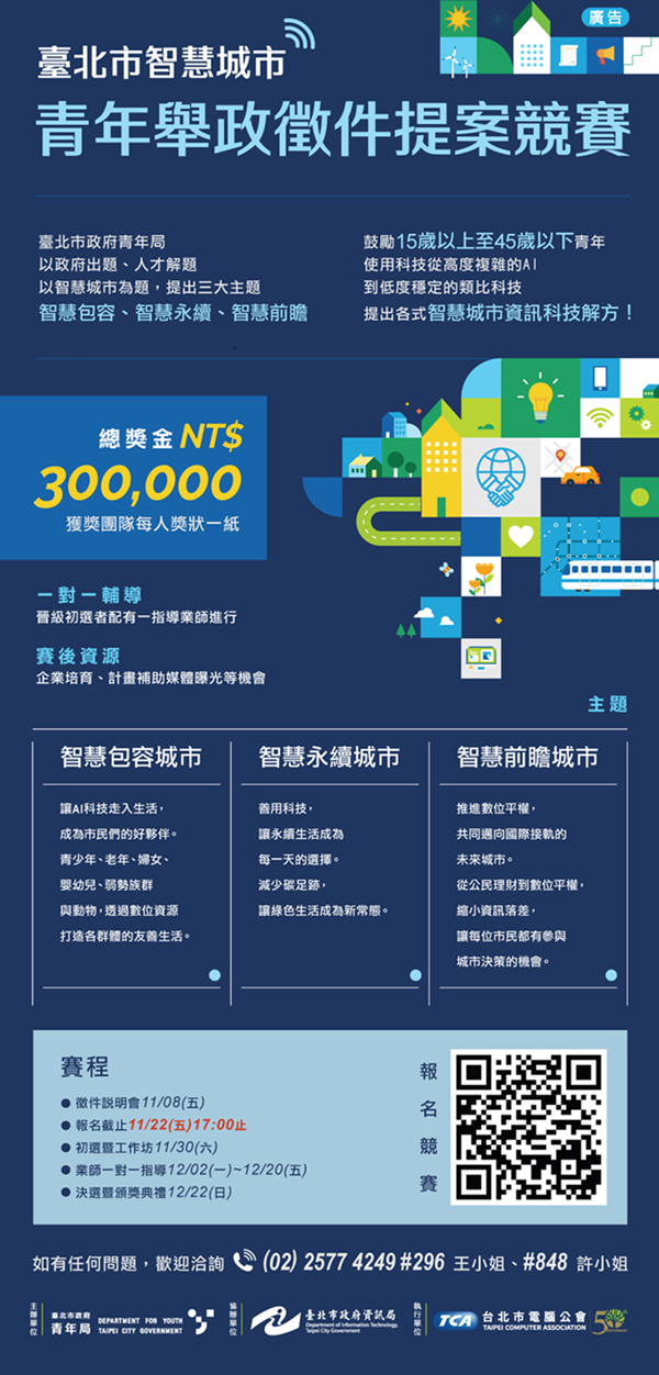 二、競賽目的:鼓勵青年參與公共政策興革,培養青年世代「資訊新創素養」,以政府出題、人才解題、企業支持,鼓勵青年積極投入公共事務,提出資訊科技解方,讓智慧城市不再僅限於專業部門或技術單位的主題。