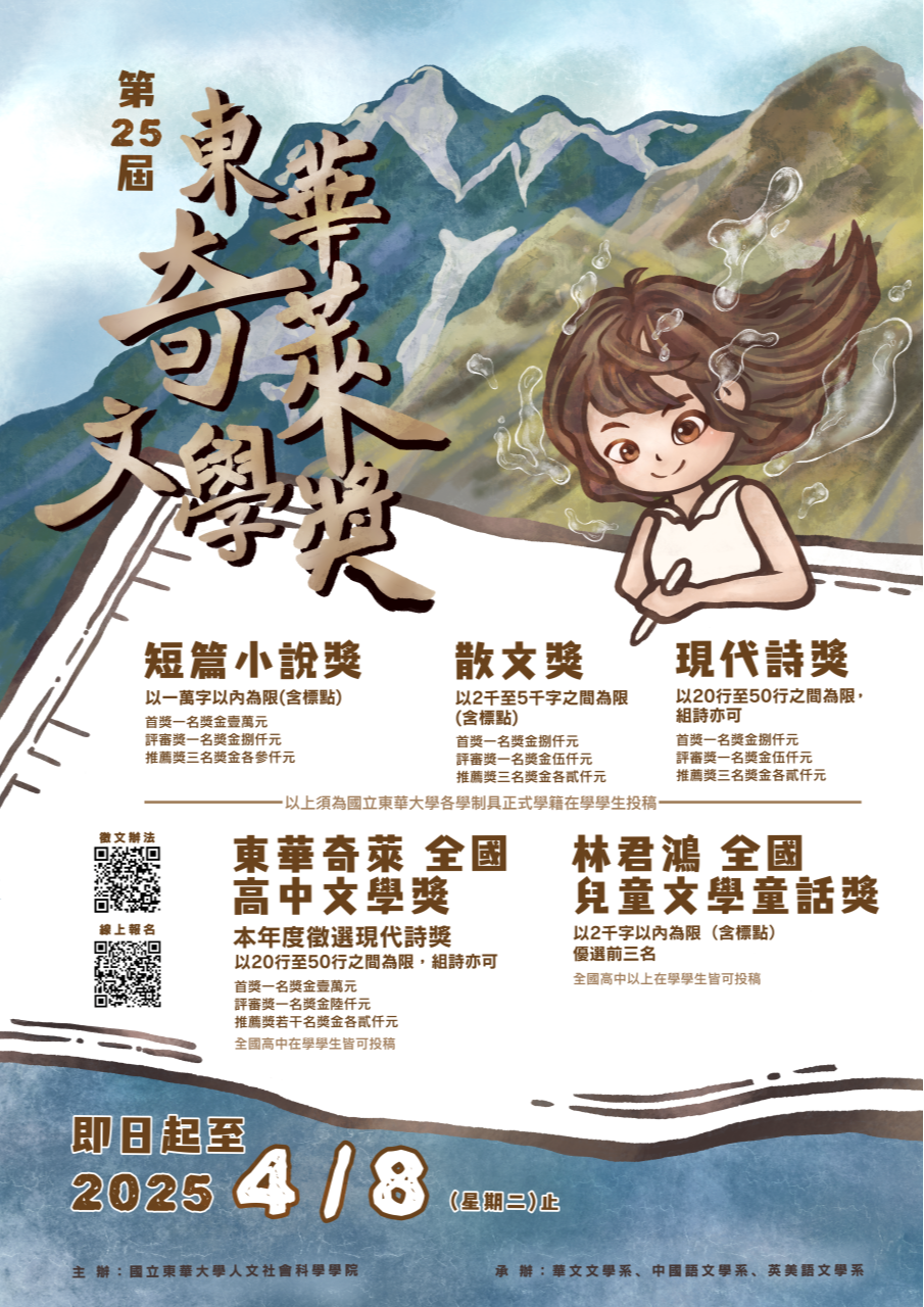一、「第25屆東華奇萊文學獎」針對高中生徵文獎項為「東華奇萊全國高中文學-現代詩獎」及「林君鴻全國兒童文學童話獎」,希冀鼓勵國內創作風氣,培養文學涵養。