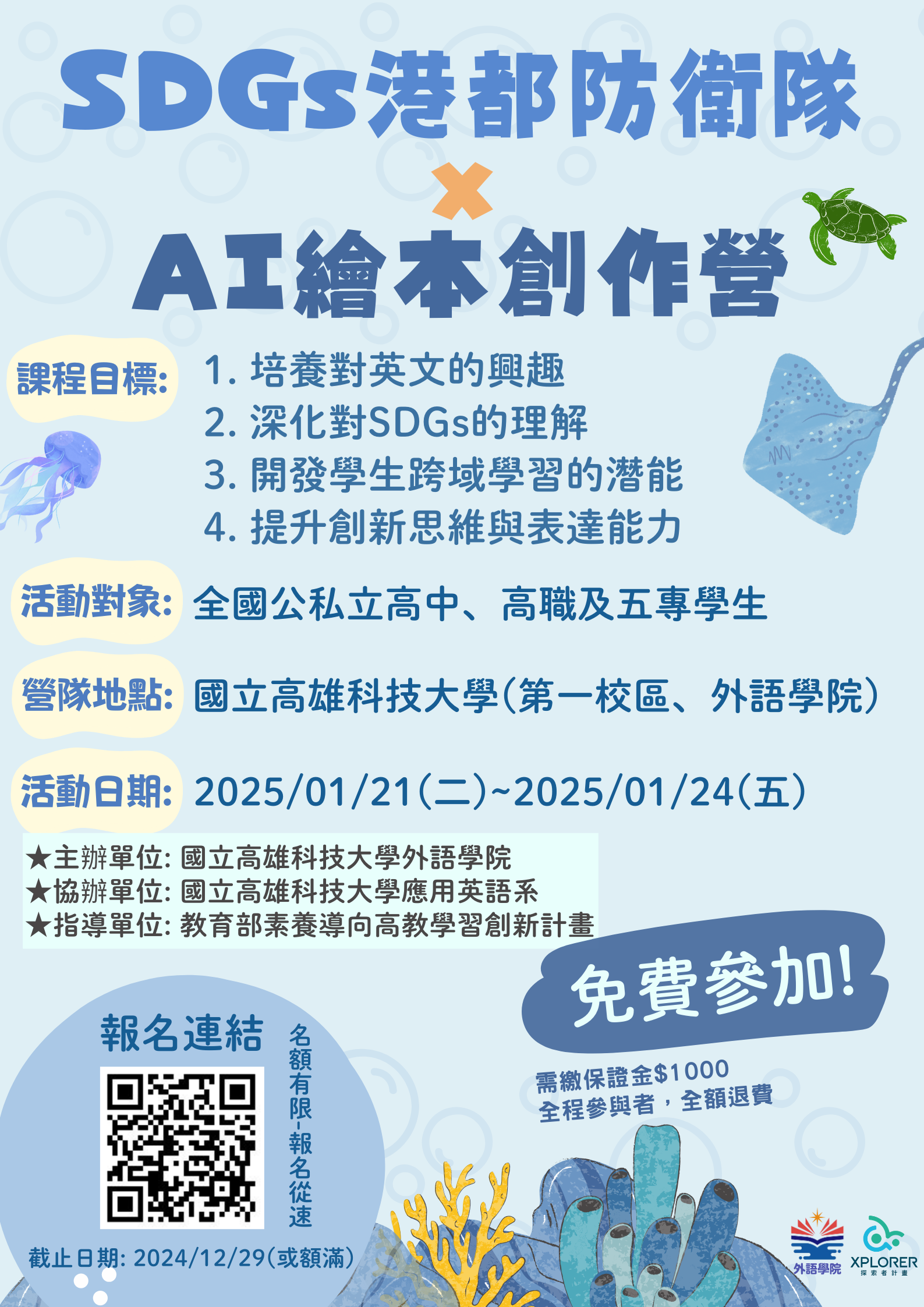 一、國立高雄科技大學外語學院舉辦「SDGs港 都防衛隊 x AI繪本創作營」,鼓勵全國公私立高中、高職及五專學生參與並深入探討海洋環境議題,並透過ChatGPT和AI繪圖生成文字及圖片,並應用於Canva設計工具中,產出數位繪本,展現對海洋保育的認識與反思。 本營隊採線上報名,額滿為止。