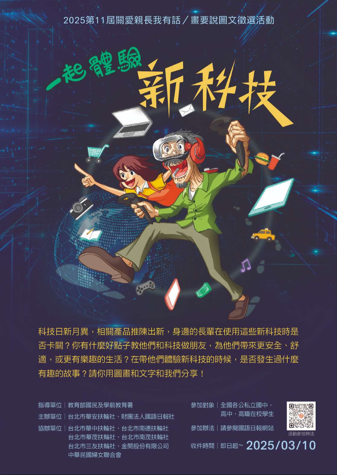 一、為鼓勵高級中等學校及國民中學學生勇於表達對親長的關愛,財團法人國語日報社與臺北市華安扶輪社共同辦理第11屆「關愛親長我有話/畫要說」圖文徵選活動。