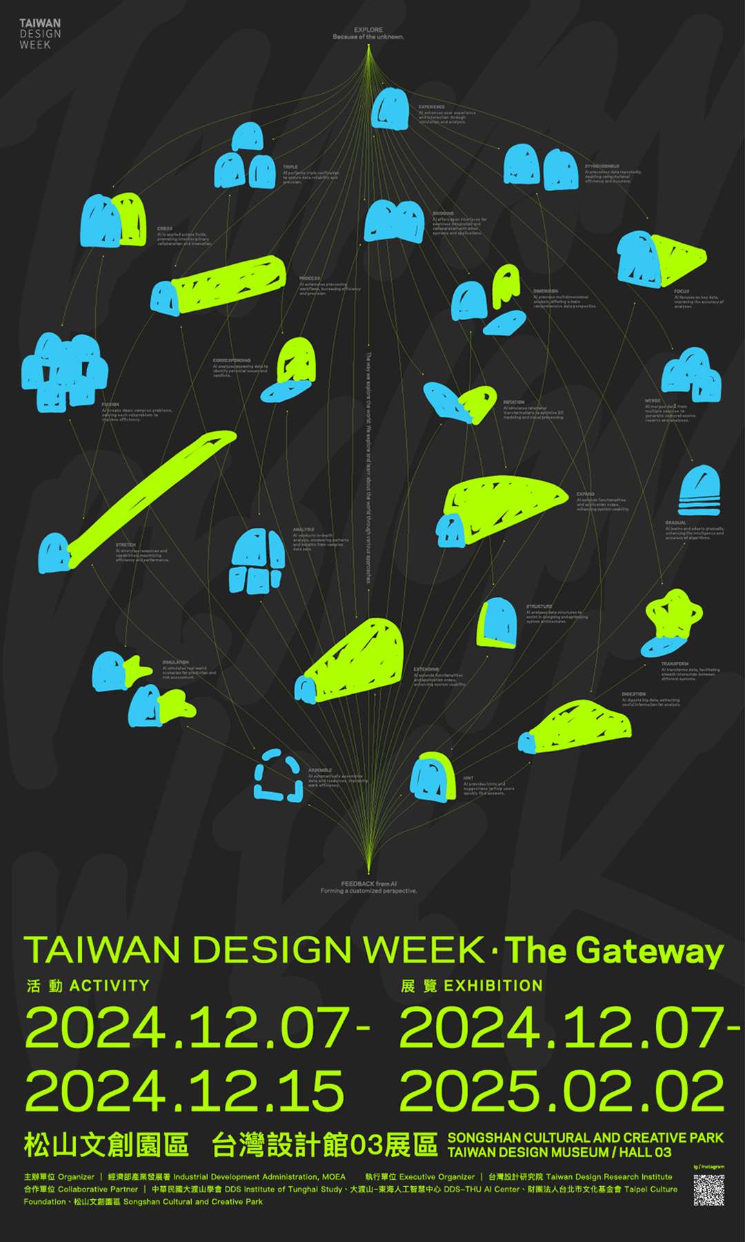 三、「台灣設計週-The Gateway」免費參觀,展期至2025年2月2日,本展匯集28組台灣設計團隊、6組國際單位共同展出,展覽強調AI工具仍由人類情感與意識驅動,人們可以自由試錯、實驗與創造。觀展者可藉此思考AI與自我連結,共同開啟通往未來的智慧之門,探索人類與AI共同創造的未來世界。