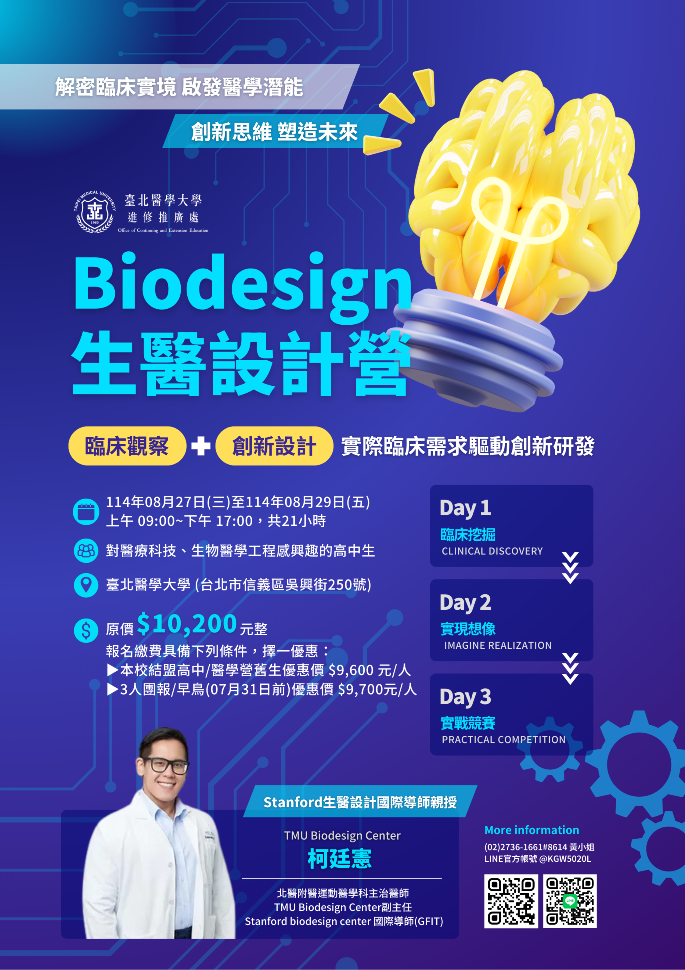 一、臺北醫學大學進修推廣處舉辦「Biodesign 生醫設計營」,結合臨床觀察與創新設計,驅動學生進行創新發想與實作競賽。