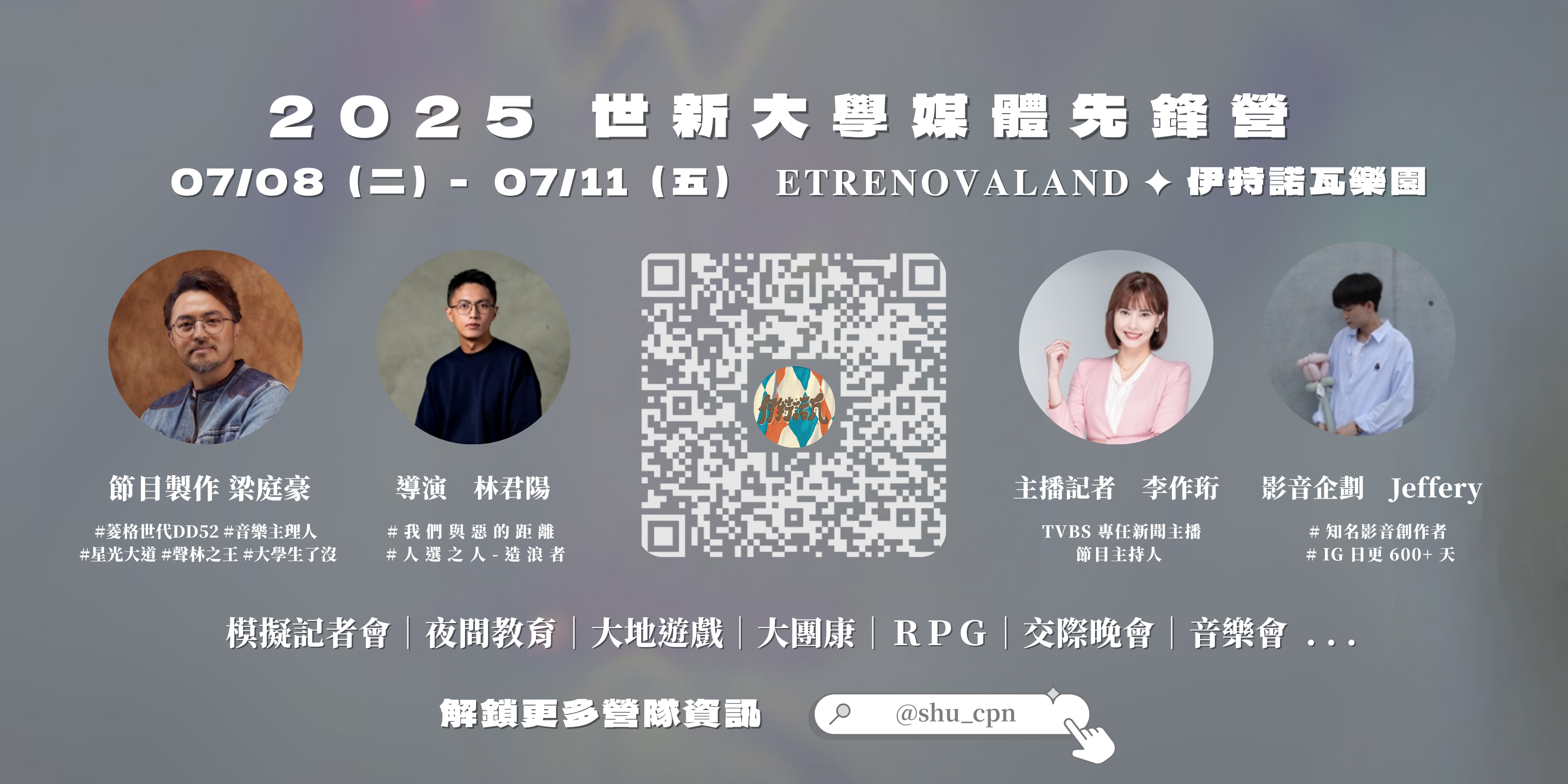 一、世新大學成報新聞社舉辦媒體性質暑期營隊,歡迎對傳播領域有濃厚興趣的高中職在學生參加。