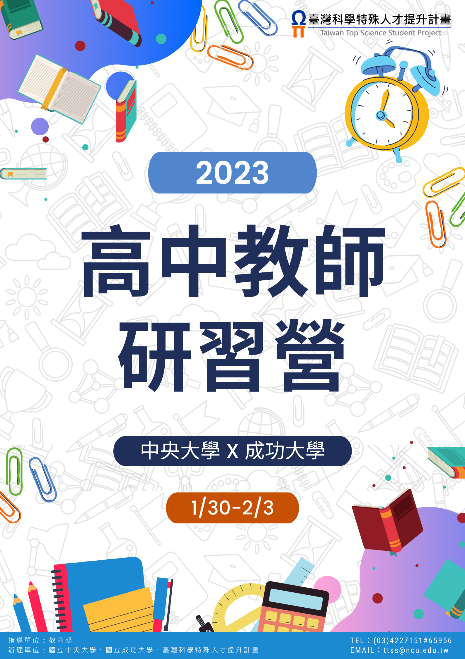 一、活動訊息如下: (一)時間:112年1月30日(一)起至同年2月3日(五)止, 共計5日。 (二)地點:國立中央大學。 (三)費用:免費(全日課程提供午餐,住宿需自理)。 (四)說明:本活動包含生物、地球科學、數學、物理、土 木、資訊、財經及企管等各領域課程,學員可依需求自 行選修部分或全部課程,授課內容請參閱活動簡章(詳 如附件)。 二、報名方式:請於111年12月28日(三)前完成線上報名,網 址:http://ps1tw.astro.ncu.edu.tw/ttss/index.php 三、惠請協助於貴校網站公布活動訊息並轉傳電子海報、簡 章,鼓勵教師踴躍報名。