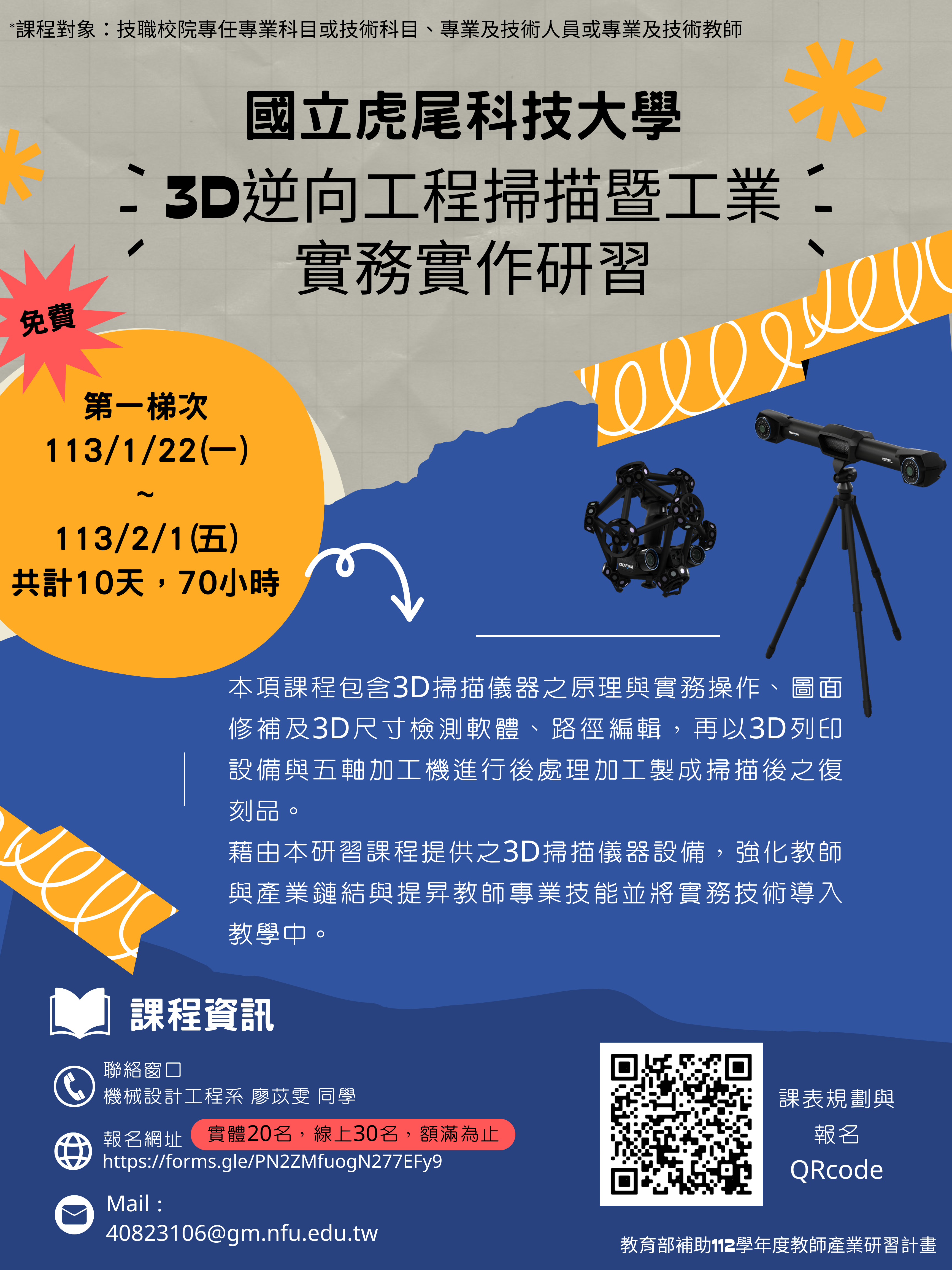 本項課程包含3D掃描儀器之原理與實務操作、圖面修補及3D尺寸檢測軟體、路徑編輯,再以3D列印設備與五軸加工機進行後處理加工製成掃描後之復刻品,
