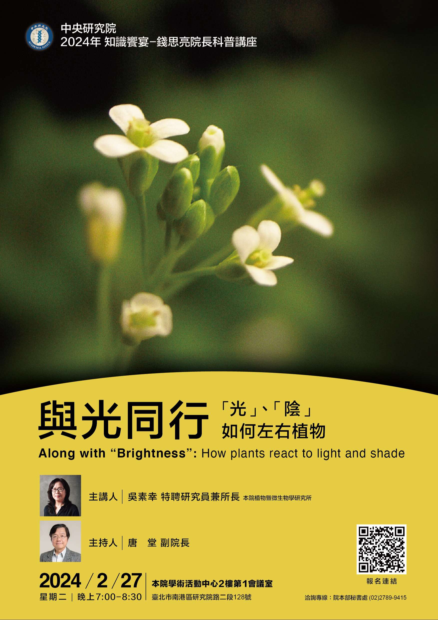 一、講座主題:「知識饗宴-錢思亮院長科普講座」邀請中研院植物暨微生物學研究所吳素幸特聘研究員兼所長,以「與光同行:『光』、 『陰』如何左右植物」為題演講。