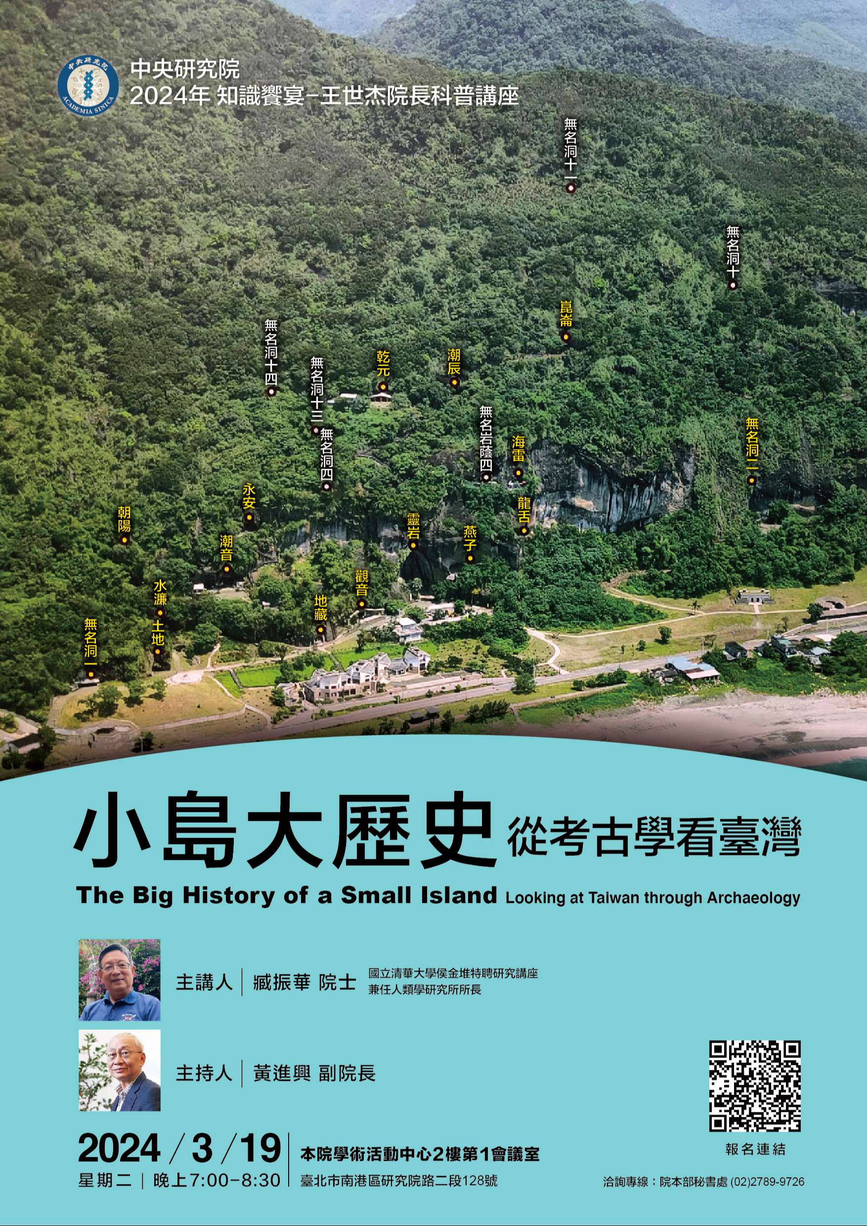 一、講座主題:「知識饗宴-錢思亮院長科普講座」邀請國立清華大學侯金堆特聘研究講座兼任人類學研究所所長臧振華院士,以「小島大歷史─從考古學看臺灣」為題演講。