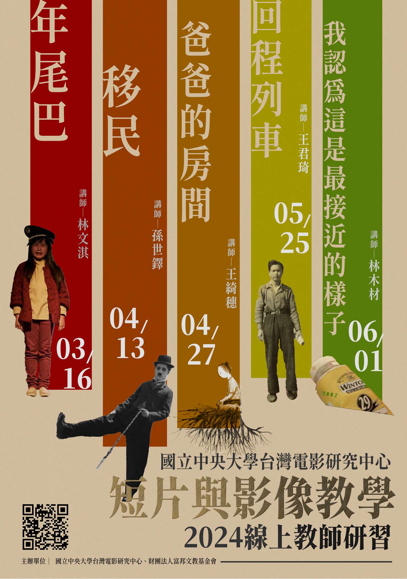 一、中央大學台灣電影研究中心長期透過辦理各式影像相關活動, 豐富學校教師對於影像教育的多元想像,落實教學增進學 生感受力與思辨力。 二、「短片與影像教學:2024線上教師研習」系列課程,邀請 國內知名電影講師及中學種子教師進行影片分析及實務分 享(四堂為獨立課程,可自由單複選報名)。 三、課程二採Google Meet線上方式辦理,時間為113年4月13日 (六)13:30-16:00。全程參與之教師可獲得全國教師在職 進修網2小時研習時數。 四、系列課程報名連結:https://forms.gle /NM4Jfk1sVSYCK1fs7,詳細內容可參考附件簡章、海報。