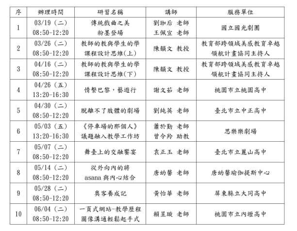 一、依據教育部國民及學前教育署107年1月15日臺教國署高字 第1060141207B號修訂「教育部國民及學前教育署高級中等 學校課程推動工作圈及學科群科中心設置與運作要點」、 113年1月16日北市陽中學科字第1136000533號函臺北市高 級中學課程與教學發展工作圈113年度工作計畫辦理。 二、研習地點:臺北市立西松高級中學。 三、旨揭研習請至「全國教師在職研習資訊網」報名。