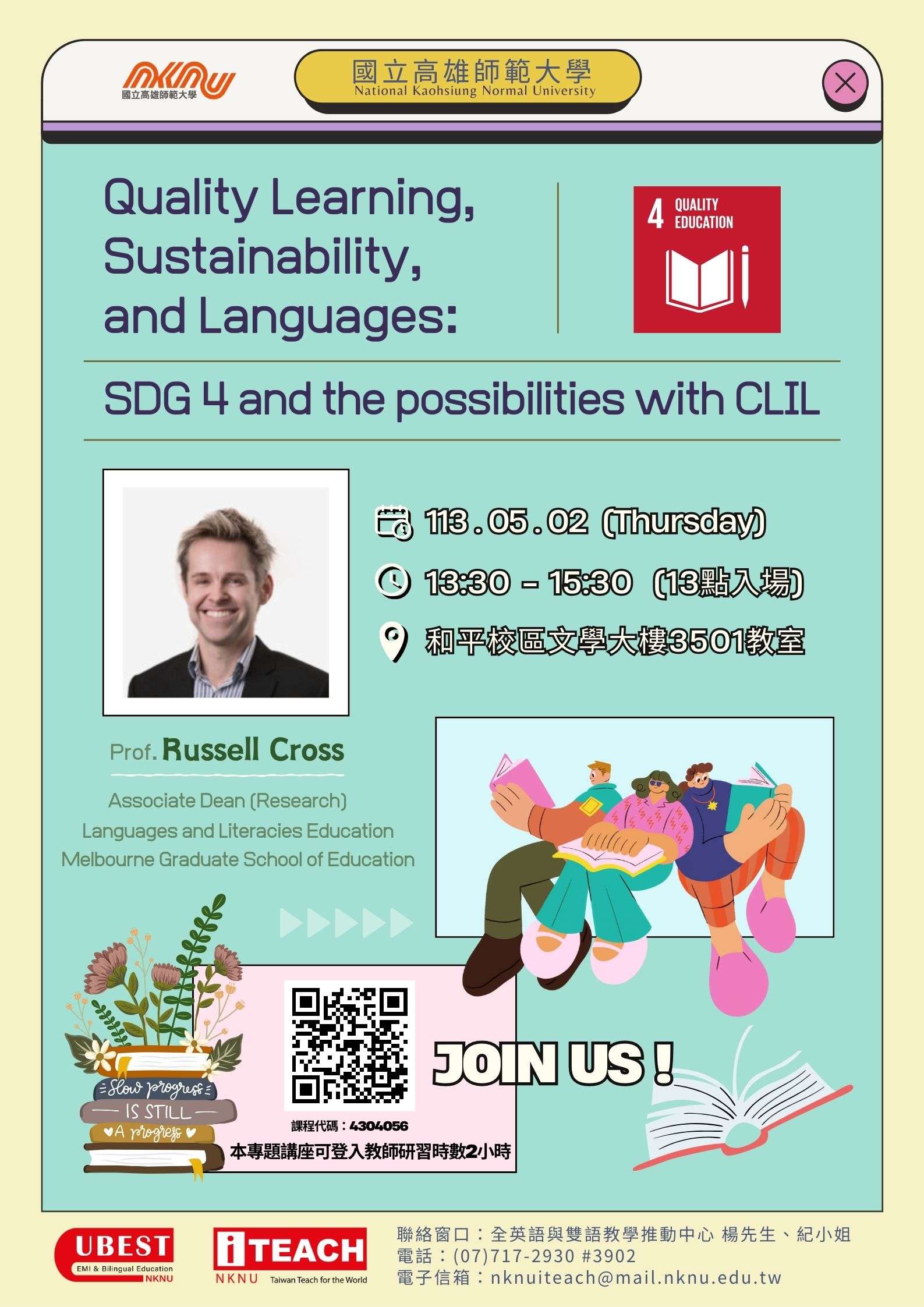 一、配合國家雙語政策,提升雙語教學授課新知,本校特邀澳 洲墨爾本大學Dr.Russell Cross, Associate Dean (Research), Languages and Literacies Education, Melbourne Graduate School of Education講授CLIL教學 技巧。 二、活動日期:113年5月2日星期四。 三、活動時間:13時30分至15時30分(13點開始入場)。 四、活動地點:本校和平校區文學大樓5樓3501教室。 五、報名期程:即日起至額滿為止。報名後,將以E-MAIL寄送錄取通知。 六、擬報名參加此活動之教師,請填具線上報名表單: https://forms.gle/GNUbeP7K6wt6pKDw6