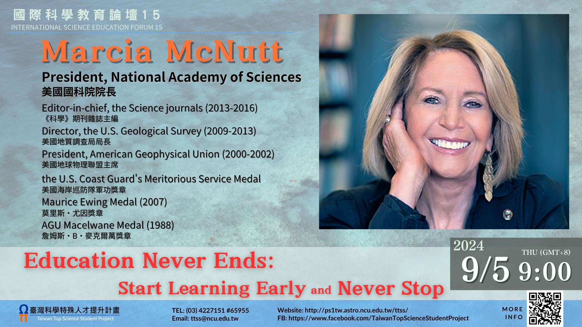一、本次講座由美國科學院院長Dr. Marcia McNutt主講。Dr. Marcia McNutt是一位地球物理學家,她的研究領域是地質年代表上地函和岩石圈的動態變化。曾任《科學》期刊雜誌主編、美國地質調查局局長及美國地球物理聯盟主席, 並因其貢獻而被授予美國海岸巡防隊軍功獎章。這場論壇同時邀請身為高等教育評鑑中心基金會董事長的李德財院士擔任主持人,來和美國科學院院長一起探討科學教育。