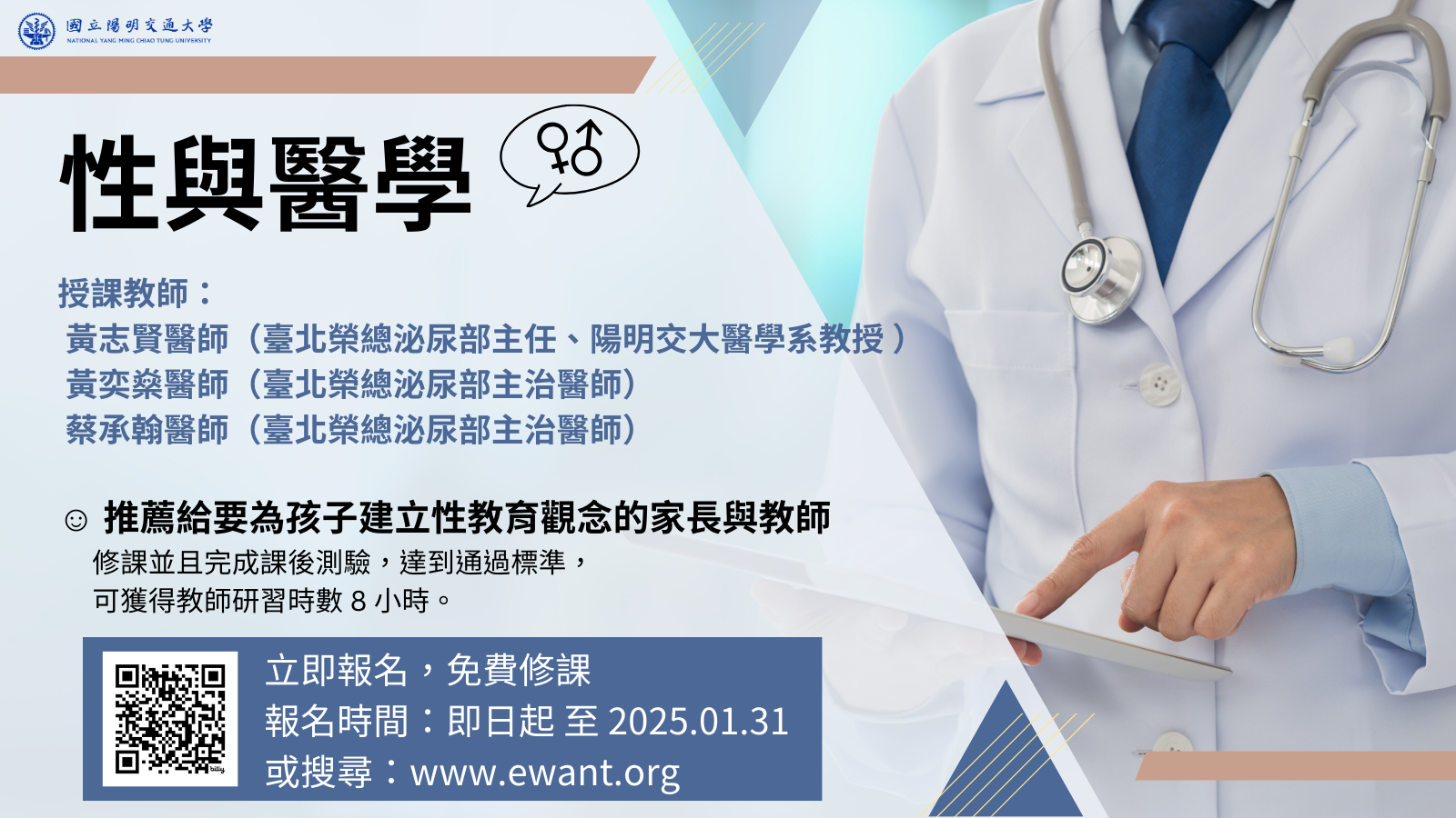 一、旨揭課程由黃志賢醫師主授(臺北榮民總醫院泌尿部主任、國立陽明交通大學醫學系教授),邀集臺北榮總的專業泌尿科主治醫師,以生殖醫學出發,製作「性與醫學」全線上數位課程,以利推動正確的衛教資訊。