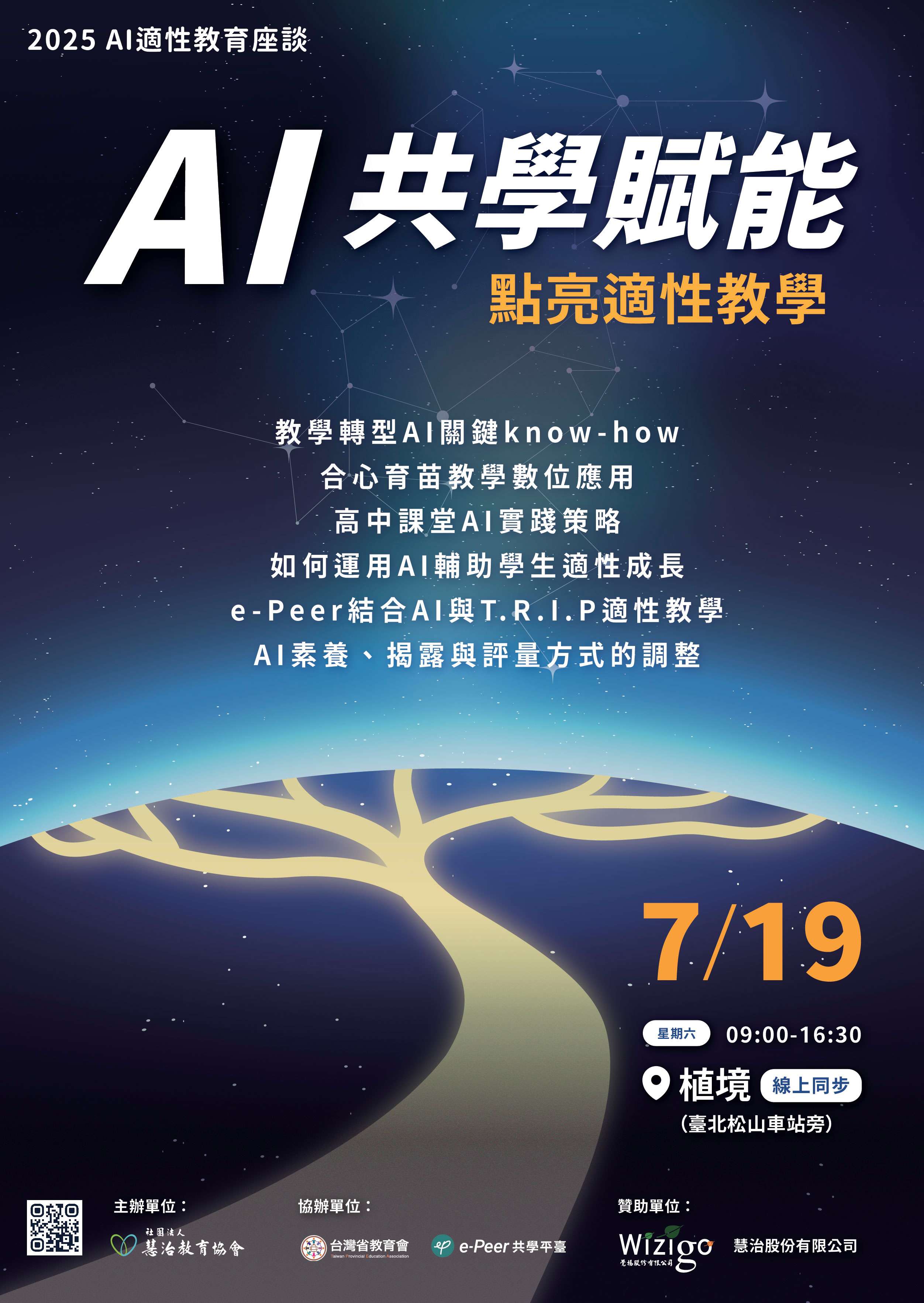 (一)社團法人慧治教育協會於暑假期間辦理「2025 AI適性教育座談」,以「AI共學賦能,點亮適性教學」為主題, 聚焦適性引導理念與AI科技應用,並結合T. R.I.P.適性教學模式架構。本活動邀請專家學者與第一 線教師,分享AI實務應用趨勢與教學案例,並導入ePeer共學平臺,引導教師善用AI工具進行教學優化。