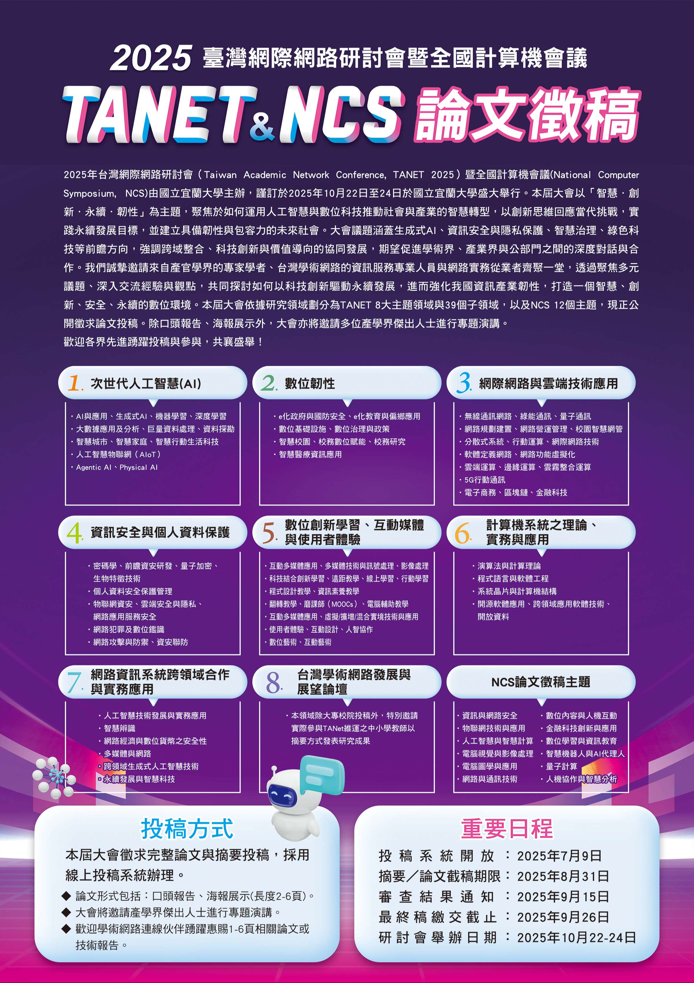 一、投稿日期:114年7月9日至8月31日截止。二、會議資訊:https://tanet2025.niu.edu.tw。