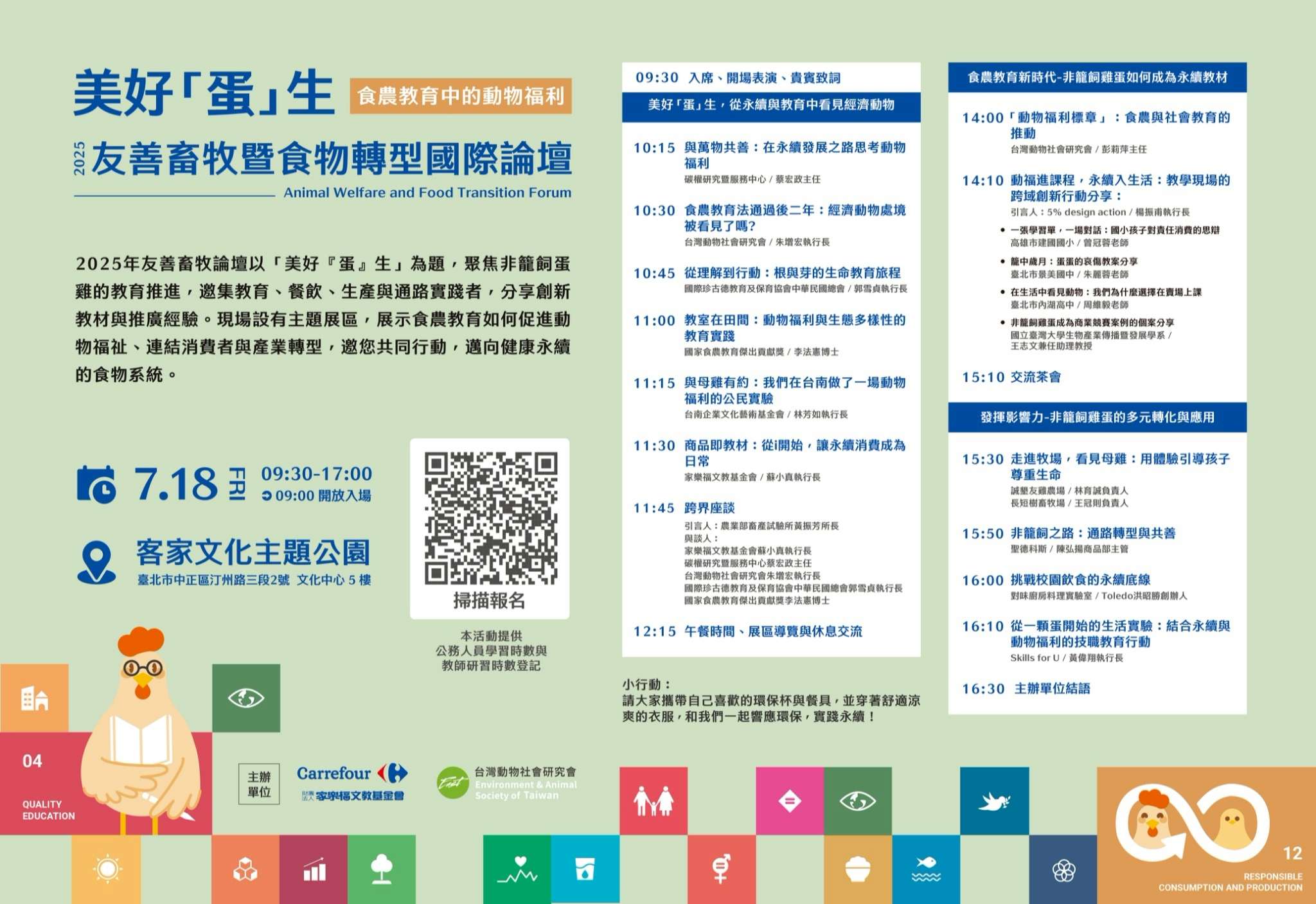 二、旨揭論壇設有【美好「蛋」生】食農教育主題展區,展示 各式創意教材與行動案例,誠摯邀請所有關心永續教育、 動物福祉與食物轉型的夥伴共同參與,檢附活動簡章及海 報供參(如附件)。