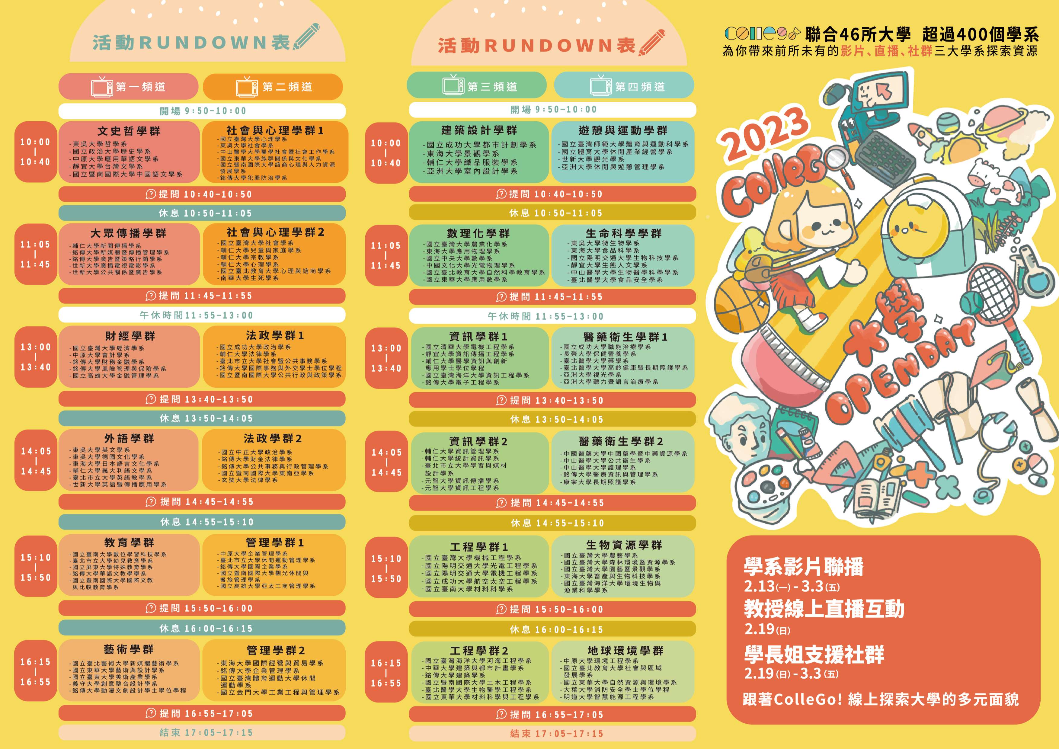 活動一、學系影片聯播(2023.2.13 - 2023.3.3):延伸本網站資料,由協辦學系為本次活動特別製作之特色影片,將於ColleGo!焦點話題專區聯合播出。