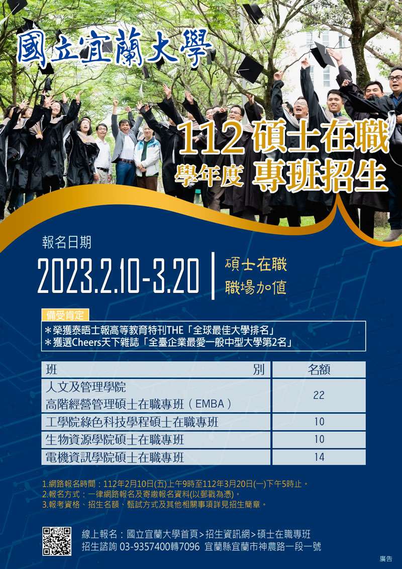 檢送國立宜蘭大學112學年度碩士在職專班招生資訊及海報,請踴躍報考。