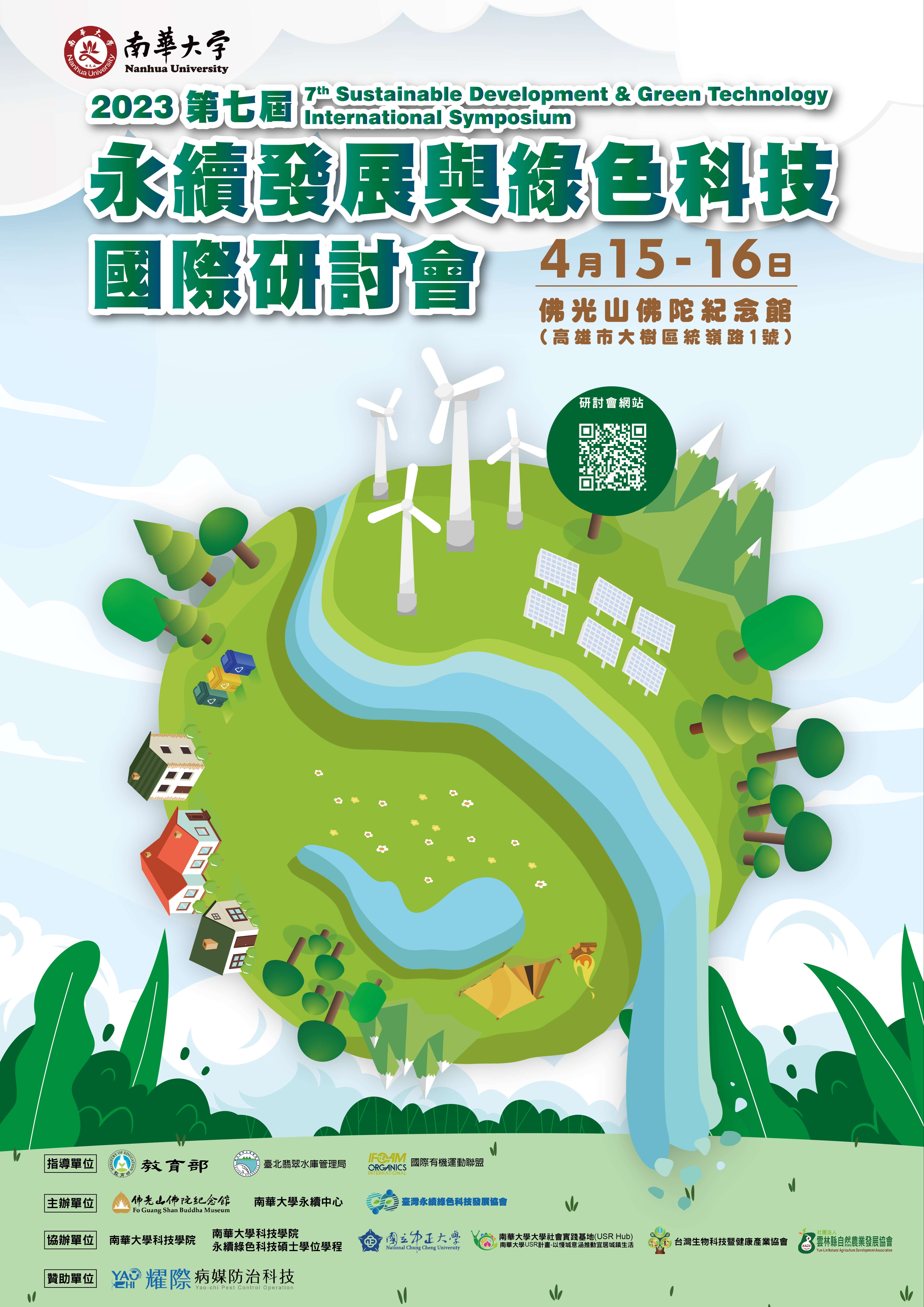 南華大學訂於112年4月15日(星期六)至16日(星期日)假佛光山 佛陀紀念館辦理「2023第七屆永續發展與綠色科技國際研 討會」,請踴躍投稿及報名。
