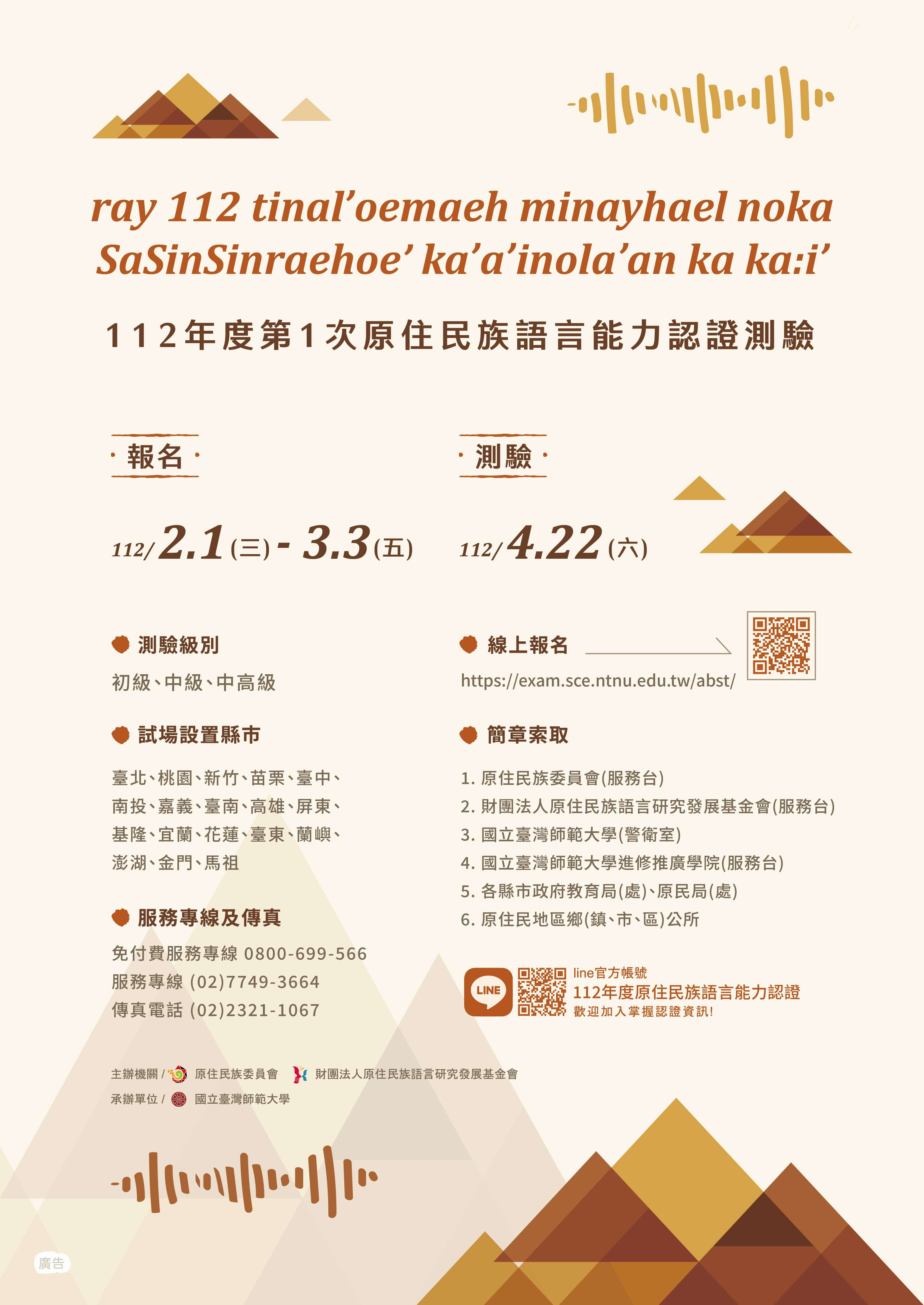一、依據教育部112年2月9日臺教綜(六)字第1120012803號函 (附件1)辦理。 二、旨揭測驗報名期間自112年2月1日(星期三)至3月3日(星 期五)止。測驗日期訂於112年4月22日(星期六)舉行。 測驗級別為初級、中級、中高級,報名資格不限國籍、族 別、年齡及學歷。 三、相關資訊及簡章(附件2、3)可至112年度第1次原住民族 語言能力認證測驗網站查詢下載(https://exam.sce. ntnu.edu.tw/abst/),考生服務專線(02)7749-3664、 0800-699-566(免付費),或加入該測驗LINE官方帳號 (@107abst)掌握最新資訊。 四、請各校將旨揭測驗資訊公告於校內電子跑馬燈及公告欄。 五、各校協助完成考生團體線上報名業務者,將由原住民族委 員會及財團法人原住民族語言研究發展基金會補助國民中 小學、高中(職)、五專及二專之代辦團體報名學校行政 費,每協助一名考生完成報名補助新壹幣50元。 六、如有相關問題,請逕洽國立臺灣師範大學進修推廣學院, 電話(02)77495412。