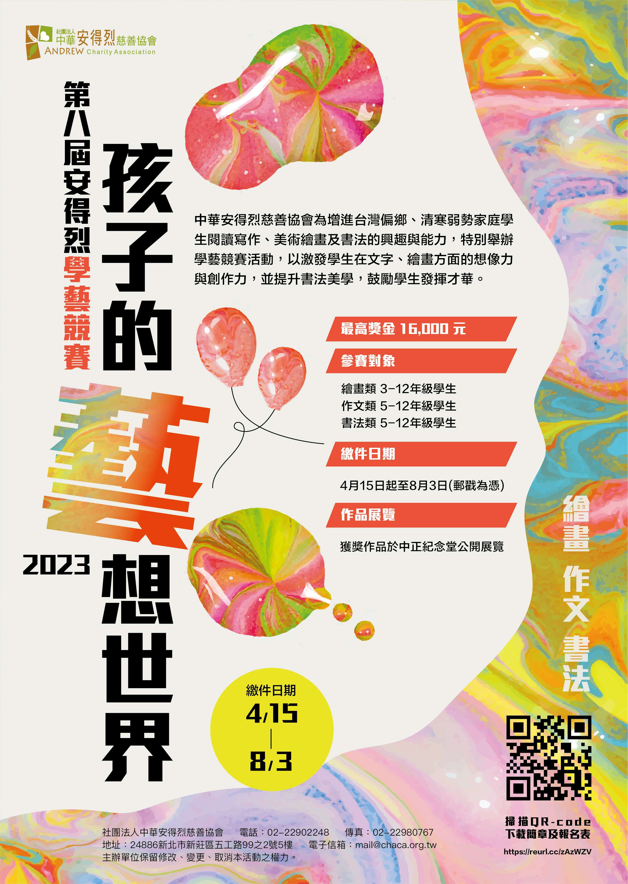 一、本會為增進台灣偏鄉、清寒弱勢家庭學生閱讀寫作、美術 繪畫及書法的興趣與能力,特別舉辦學藝競賽活動,以激 發學生在文字、繪畫方面的想像力與創作力,並提升書法 美學,鼓勵學生發揮才華。 二、今(112)年為本協會辦理之第八屆學藝競賽,比賽類別及年 齡分組概述如下: (一)繪畫類: 1.國小3-4年級組。 2.國小5-6年級組。 3.國中7-9年級組。 4.高中(職)10-12年級、五專1-3年級組。 (二)作文類: 1.國小5-6年級組。 2.國中7-9年級組。 3.高中(職)10-12年級、五專1-3年級組。 (三)書法類: 1.國小5-6年級組。 2.國中7-9年級組。 3.高中(職)10-12年級、五專1-3年級組。 三、徵稿日期:自112年4月15日起至8月3日止,以郵寄方式繳 交作品。收件人:邱議鋒先生,收件地址:新北市新莊區 五工路99之2號5樓。 四、活動宣傳海報可下載列印、公布運用。 五、詳細活動辦法如附件。
